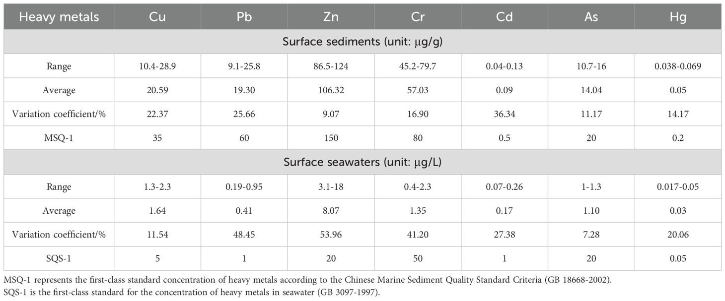 1. Concentrations of all heavy metals in surface sediments and seawater were within China’s Class I standards, indicating generally good environmental quality.