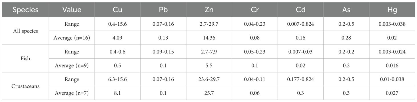 Biological samples revealed species-specific accumulation trends, with metal levels reported in μg/g wet weight: Cu (0.4–15.6), Pb (0.07–0.16), Zn (2.7–29.7), Cr (0.04–0.23), Cd (0.007–0.824), As (0.2–0.5), and Hg (0.003–0.038). The mean concentrations were 4.09, 0.13, 14.36, 0.08, 0.16, 0.28, and 0.02 μg/g, respectively (Table 4).