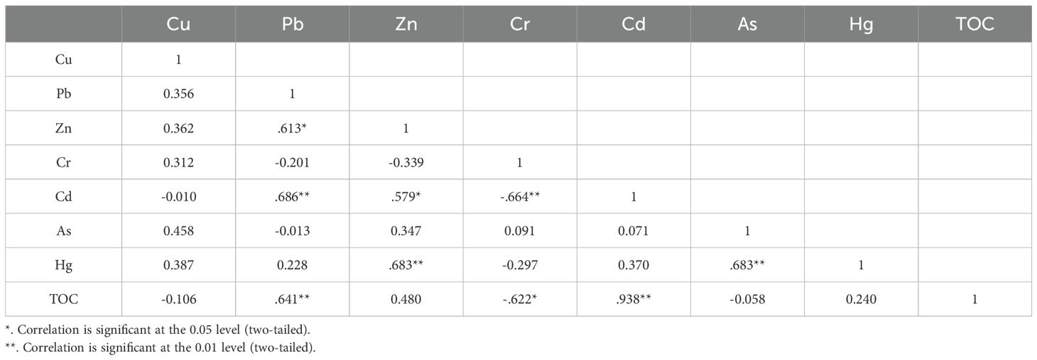 Pearson correlation analysis was used to examine the relationships between heavy metals and total organic carbon (TOC). The correlation coefficient r ranges from -1 to 1, where values close to 1 or -1 indicate strong positive or negative linear relationships, respectively.