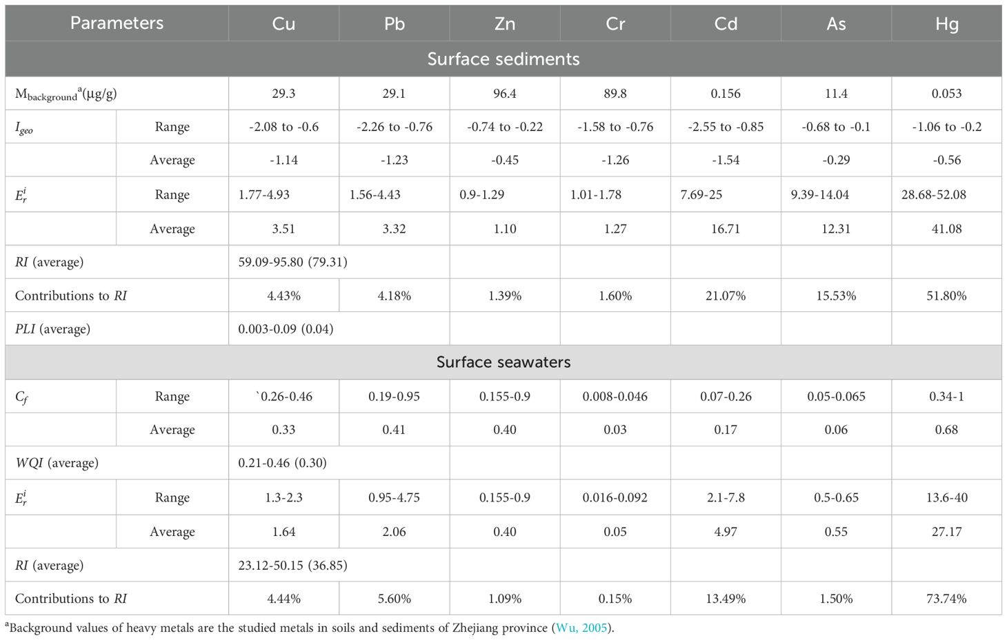 Table 6. Background value, Igeo, , RI, PLI values for surface sediments and Cf, WQI, RI values for surface seawaters of heavy metals in Yuhuan coastal area.