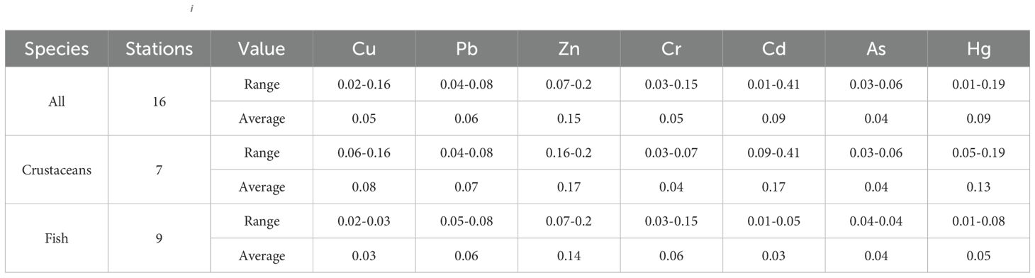 Statistical analysis indicated distinct distribution patterns of HM concentrations between the two marine organism groups in the Yuhuan coastal area. The metal concentration rankings in fish and crustaceans were as follows: Zn > Cu > As > Pb > Cr > Cd > Hg for fish, and Zn > Cu > As > Cd > Pb > Cr > Hg for crustaceans. Notably, elevated As levels in both groups point to possible environmental contamination. According to the biological quality benchmarks outlined in China’s Coastal Zone and Marine Resource Comprehensive Survey Guidelines, the Pi for all heavy metals in both fish and crustaceans were below 1 (Table 7), indicating compliance with established safety thresholds.