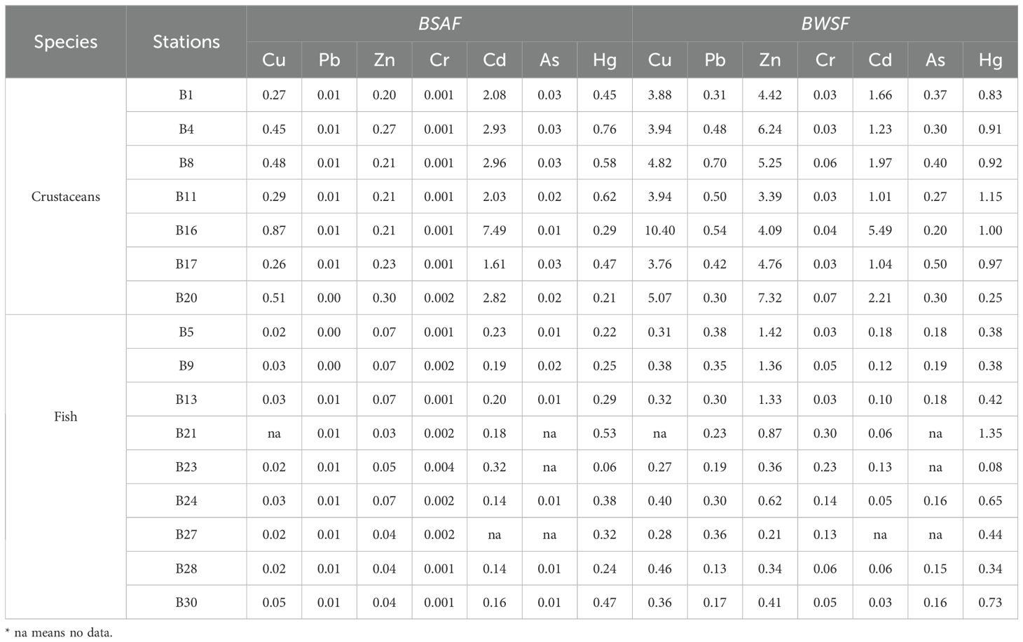 In contrast, most BWAF values exceeded 1, indicating efficient bioaccumulation from the aqueous phase—even amid generally low dissolved metal concentrations in ambient seawater. This suggests that metals are effectively concentrated through trophic transfer in the water column, consistent with prior research (Harada, 2016; Hoai et al., 2020; Islam and Tanaka, 2004). The divergence in accumulation patterns between sediment and aqueous pathways underscores the complex mechanisms governing metal transfer in marine ecosystems.