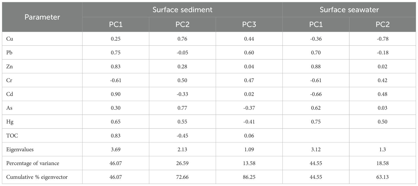 To identify potential sources of HMs in the environment, PCA was conducted using SPSS software. For surface sediments, three principal components (PCs) with eigenvalues greater than 1 were extracted, collectively accounting for 86.25% of the total variance (Table 9), which captures the majority of the dataset’s variability (Waykar and Petare, 2016).