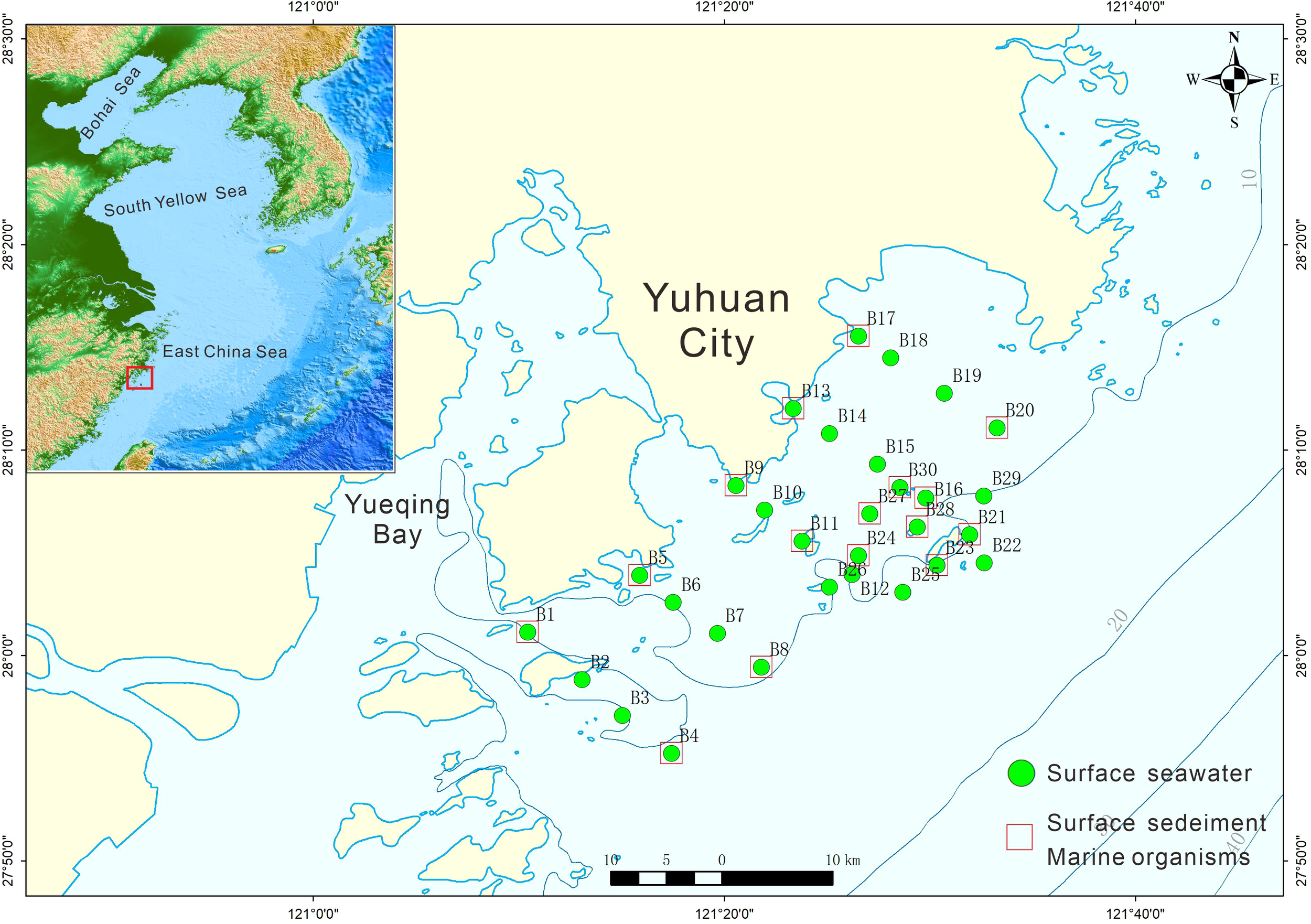 In 2023, a total of 30 surface seawater samples, 16 surface sediment samples, and multiple marine organism samples were collected from the coastal region of Yuhuan (see Figure 1). All sampling, preservation, and transportation procedures strictly followed the standards prescribed in the “Specifications for Oceanographic Survey” (GB/T 12763-2007).