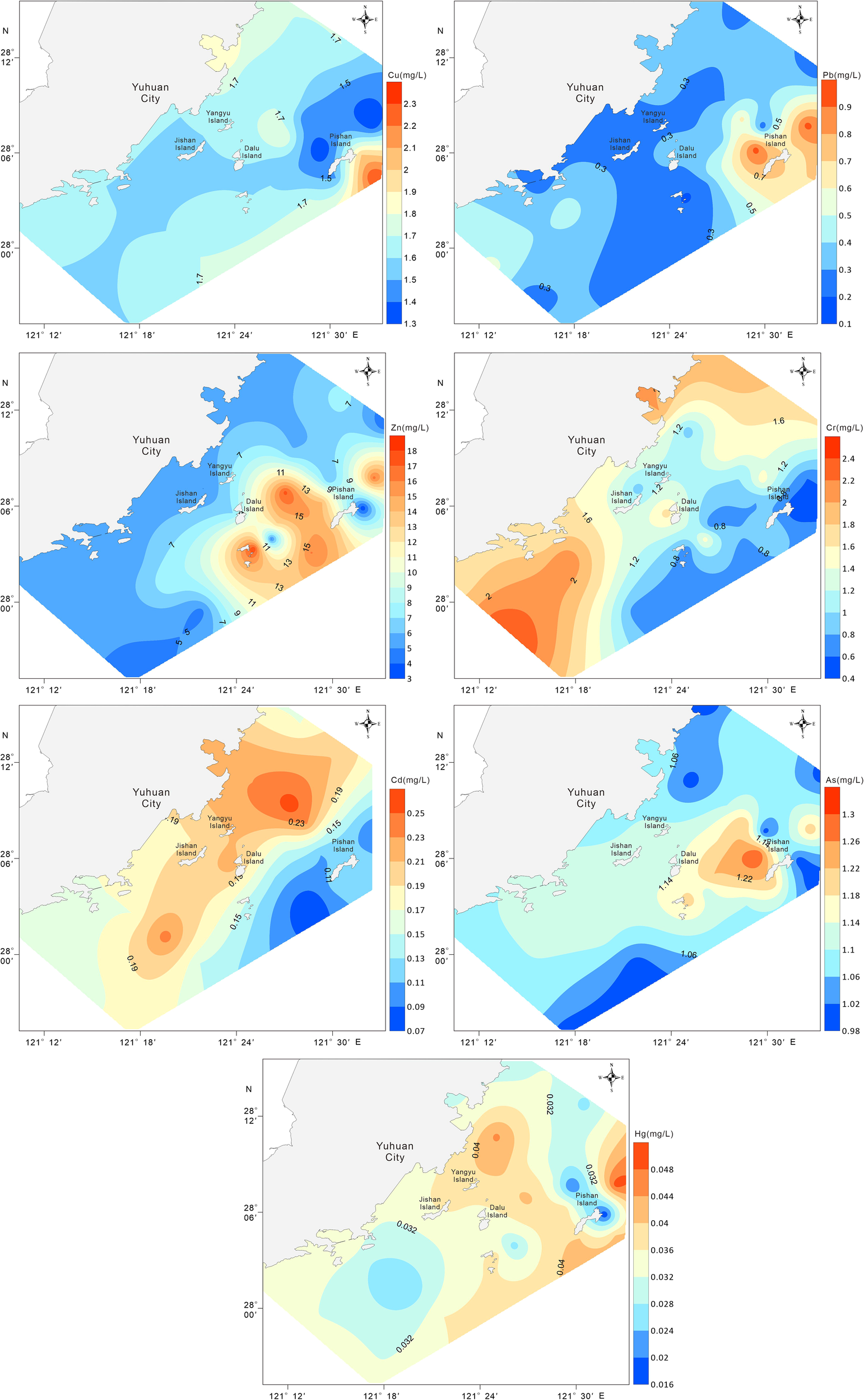 Spatial distributions of seven heavy metals in the surface seawaters.