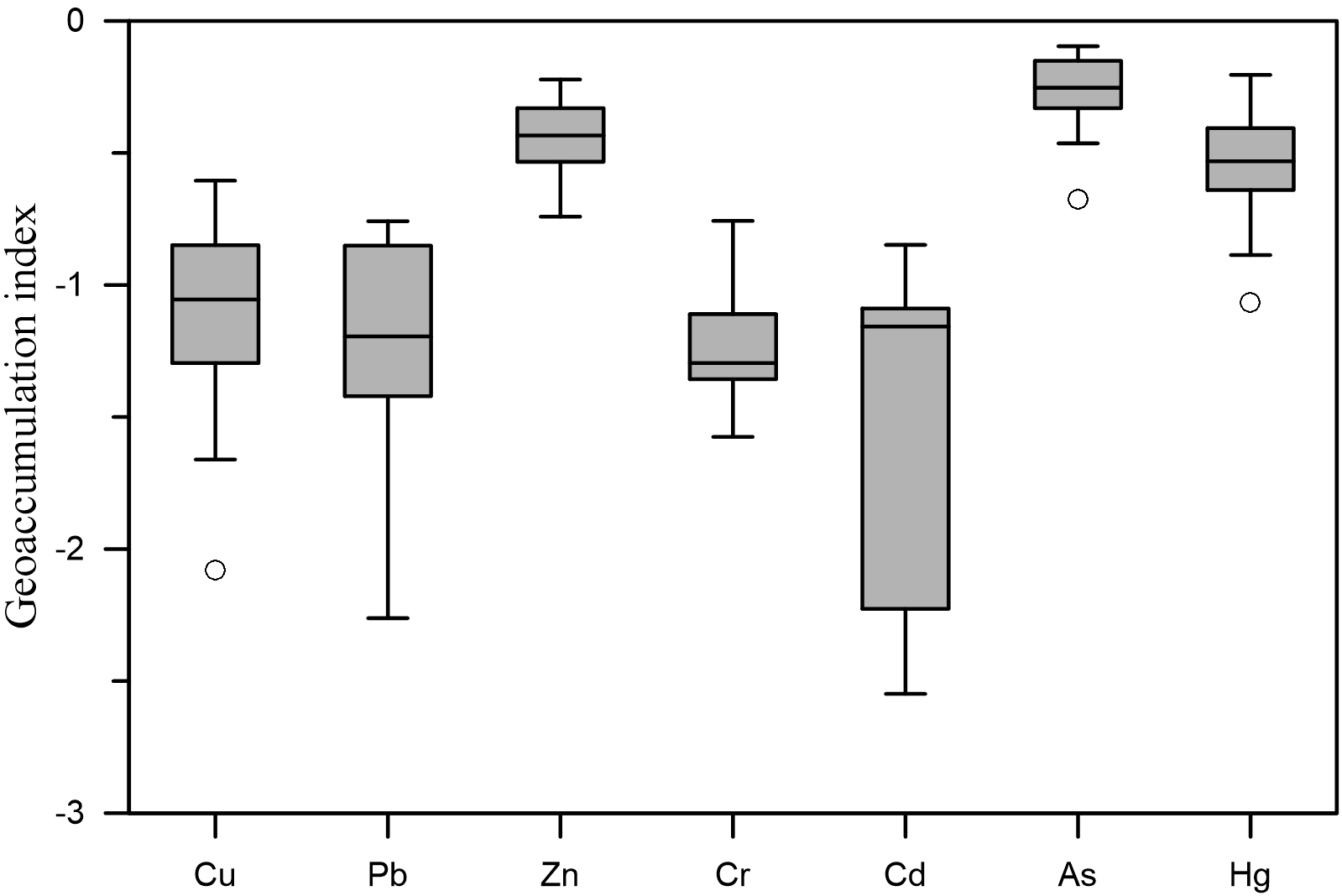 where Ci is the HM concentration in sediment and Bi is the regional background value from the studied metals in soils and sediments of Zhejiang province (Wu, 2005). Igeo values are categorized from uncontaminated (Igeo ≤ 0) to severely contaminated (Igeo > 5) (Muller, 1981).