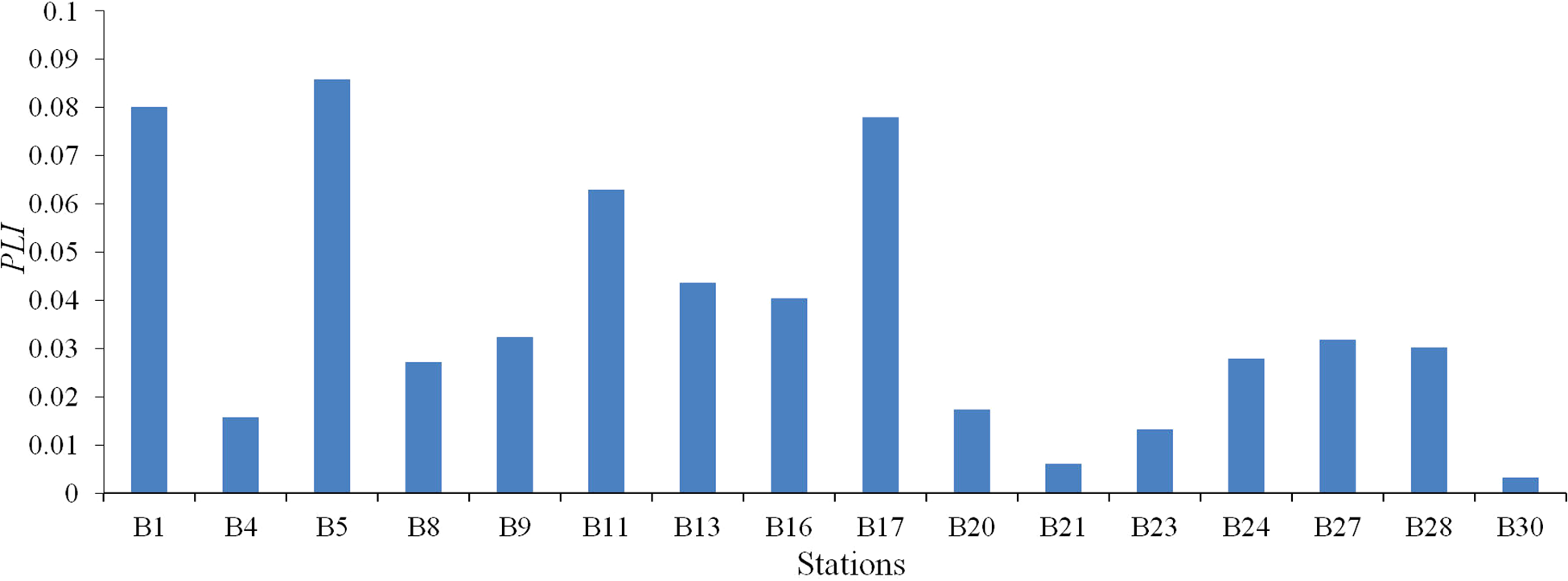 where CFi is the contamination factor of metal i, Ci is its measured concentration, and C0 is the geochemical background value. PLI < 1 indicates no pollution, while PLI > 1 suggests pollution (Chakravarty and Patgiri, 2009).
