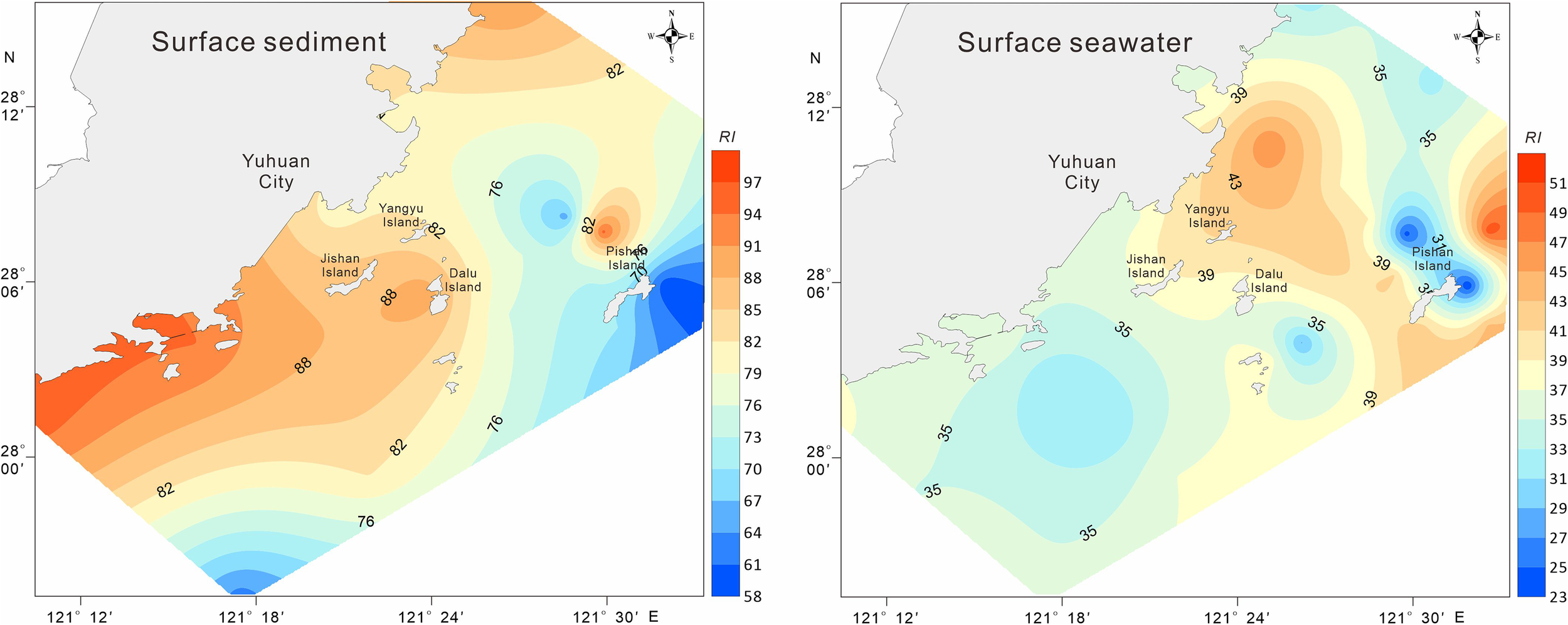 Heavy metal concentrations in the surface sediments and surface seawater in Yuhuan coastal area.