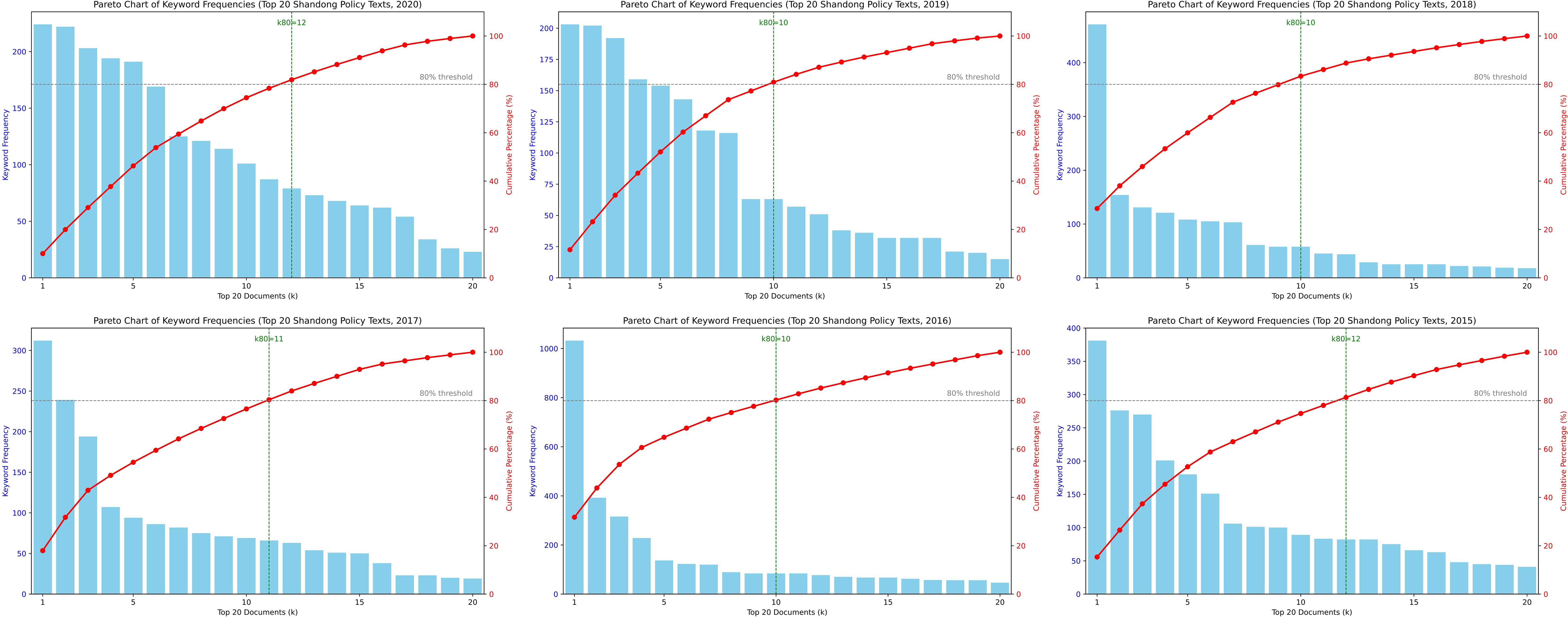 Figure 2. A set of Pareto charts showing the keywords contained in the policy documents issued by Shandong Province in each of the past six years.