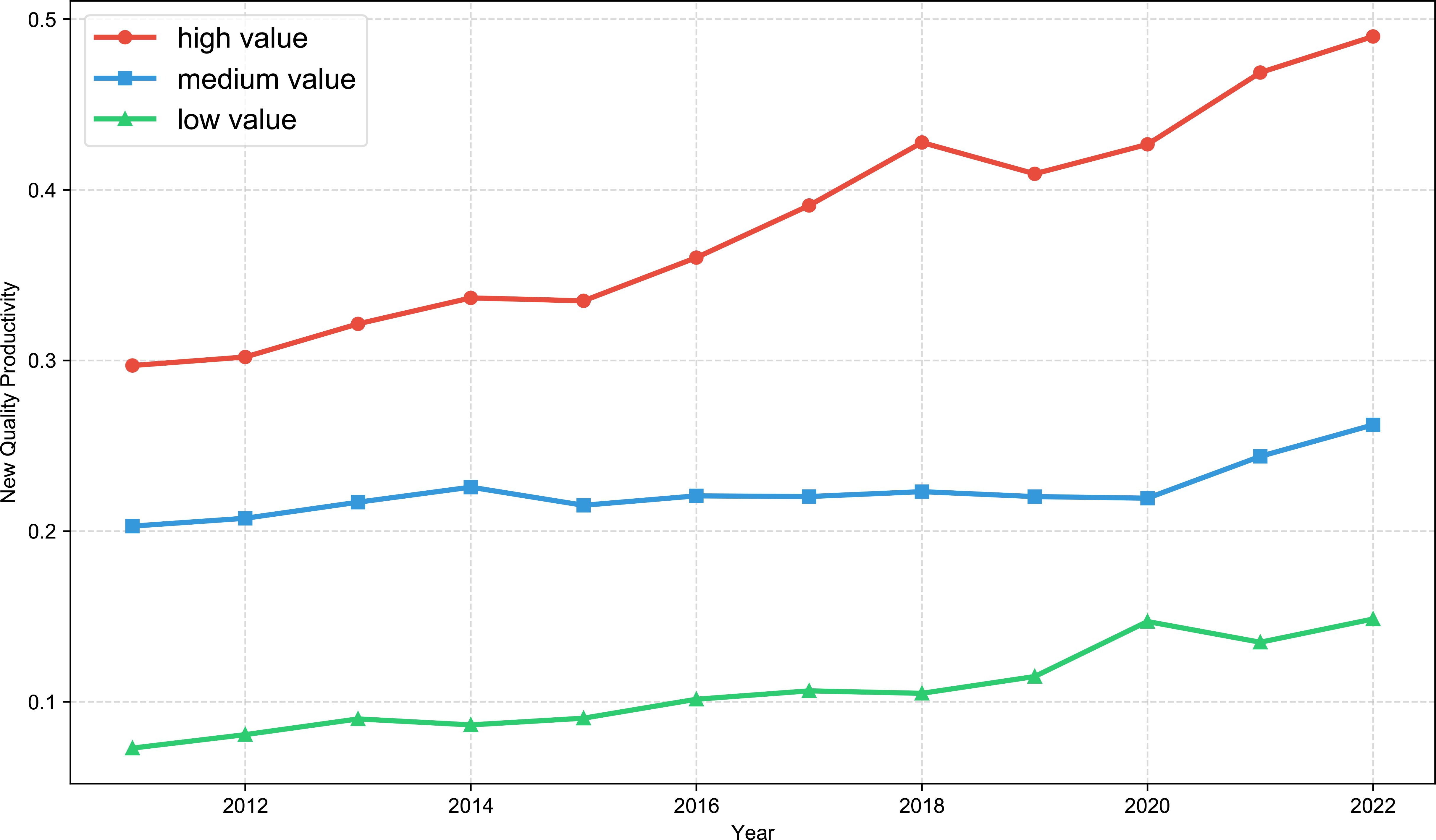 To further analyze the differences among provinces with varying development levels, this section employs the natural breaks method to classify the 11 coastal provinces into three tiers: high, medium, and low development levels. The low-level group includes Hebei, Guangxi, and Hainan; the medium-level group consists of Tianjin, Liaoning, Jiangsu, and Fujian; and the high-level group comprises Shanghai, Zhejiang, Shandong, and Guangdong. Figure 3 illustrates the temporal trends in new quality productivity development across these three regional categories.