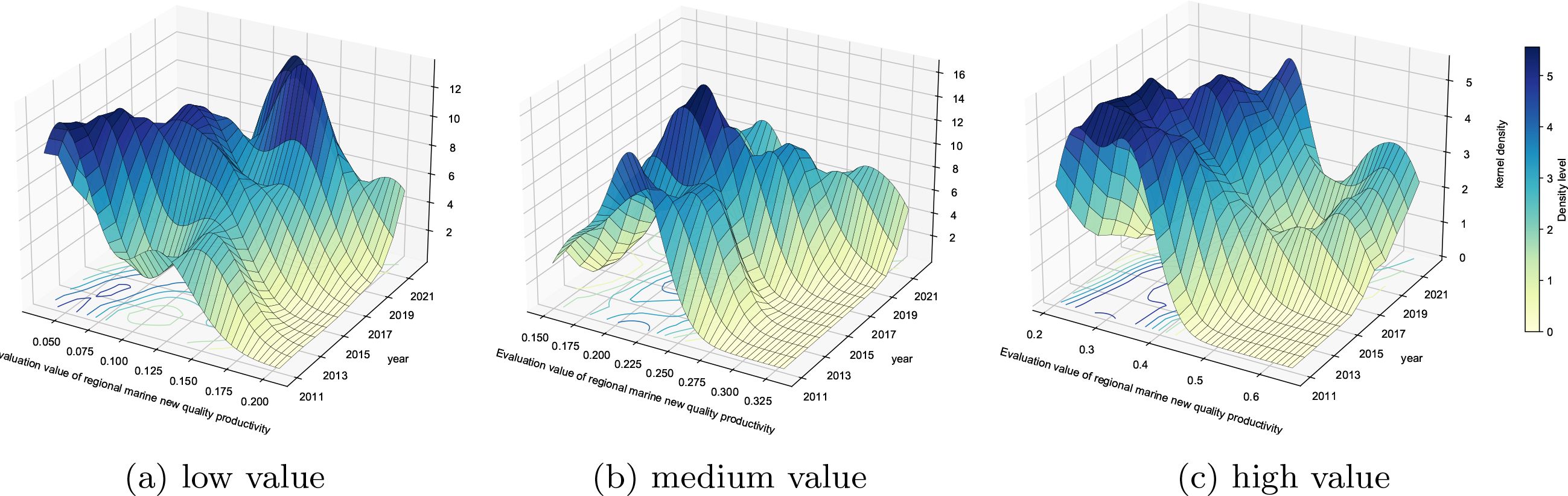 Figure 4. 3D Kernel density plots of regional marine new quality productivity (2011-2022). (a) Low-level group. The surface’s primary peak lies within the 0.15-0.22 range, gradually shifting rightward over time with its right tail extending to approximately 0.25. Overall dispersion remains modest yet predominantly concentrated at low values, reflecting Hebei and Guangxi’s sustained low positions alongside Hainan’s incremental improvement (from approximately 0.198 to 0.259 between 2011 and 2022). (b) Medium-level group. The primary peak gradually shifted from 0.20-0.26 to 0.24-0.30, exhibiting periodic ‘plateau/mild dual-peak’ phenomena: One side corresponds to the decline and fluctuations in Liaoning and Tianjin around 2014-2017 (e.g., Liaoning’s drop after reaching 0.249 in 2014), while the other side reflects Jiangsu’s sustained rise (to 0.323 by 2022). After a slight widening, differentiation within this group tends towards convergence. (c) High-level group. The primary peak shifted markedly to the right and elevated, with distribution transitioning from 0.26-0.30 to 0.31-0.38. A ‘jump’ characteristic emerged around 2017 (exemplified by Shanghai’s rise to 0.350 in 2017), Subsequently, density converged within the high-value zone, indicating stable high-level clustering and a ‘growth pole’ effect (e.g., Shanghai reaching 0.407 by 2021 and Guangdong reaching 0.351 by 2022).