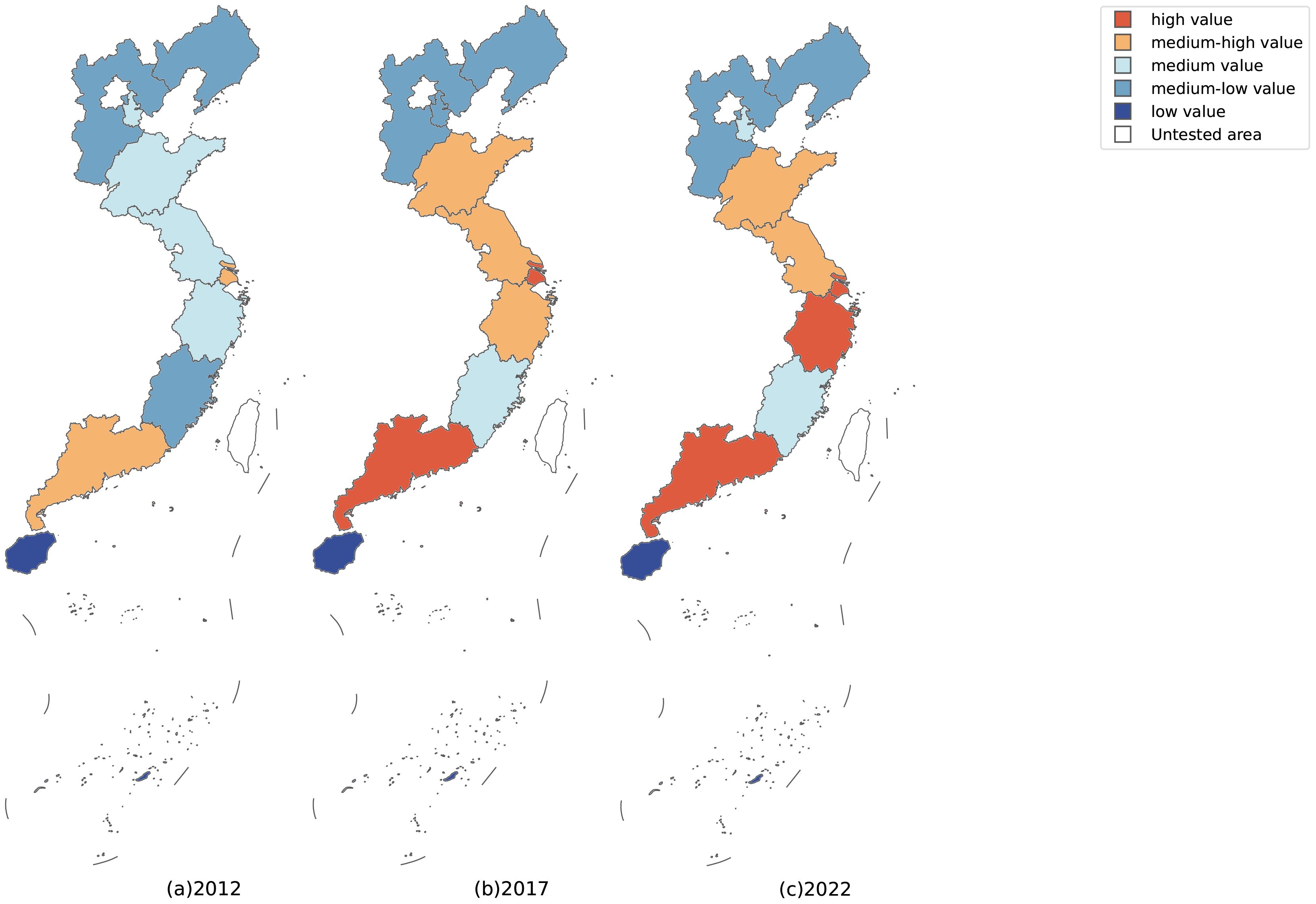 Figure 5. Spatial and temporal variations in the high-quality development of marine new- quality productivity in coastal provinces. This standard map was produced based on the standard map downloaded from the Ministry of Natural Resources’ Standard Graphic Service Map Service website, with the review number GS(2020)4619. (a) 2012: This map shows a concentration of low-to-medium value regions, with Shanghai and Guangdong as emerging high-value areas. (b) 2017: High-value zones expanded to include Jiangsu, Zhejiang, and Shandong, showing a shift from point-like clustering to belt-shaped enhancement. (c) 2022: By 2022, core eastern provinces formed stable high-value clusters, while regions like Hebei and Guangxi remained at lower levels.