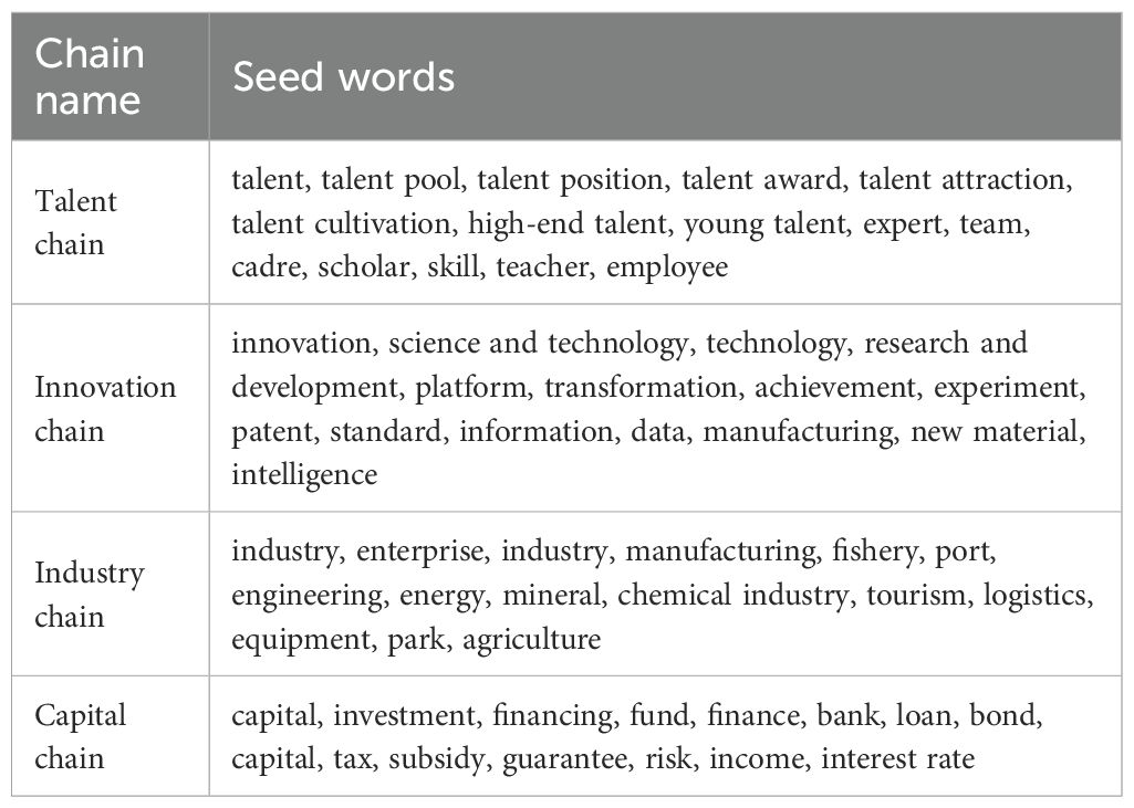 Based on the research needs in the field of marine economic policy, this paper focuses on four chains: talent, innovation, industry, and capital, and constructs 12 related seed lexicons respectively. The construction of these lexicons is based on the core elements of marine economic development, and combines China’s policy orientation towards the marine economy in recent years. The specific seed word libraries corresponding to each chain are shown in Table 2.