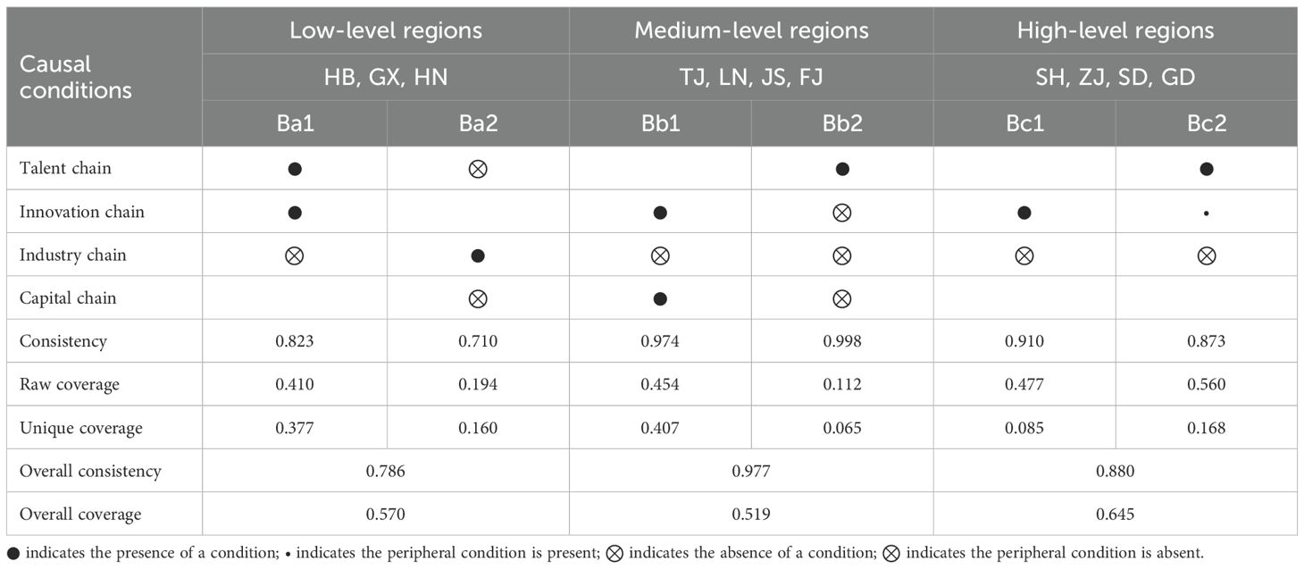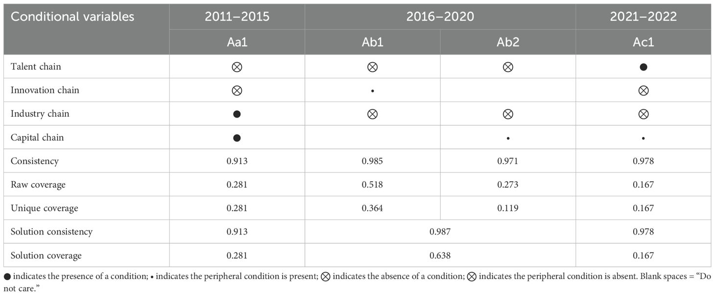 a. Evolution of Policy-Driven Pathways Across Time (Table 4) Table 4 demonstrates marked differences in policy pathways across three developmental phases. During the 12th Five-Year Plan period (2011-2015), policy focus centred on industrial chain development, with government emphasis on marine industry scale expansion and infrastructure construction. However, limited policy investment in talent and innovation chains resulted in new productive forces relying predominantly on traditional factor-driven approaches. During the 13th Five-Year Plan period (2016-2020), policy attention simultaneously increased for both innovation and industrial chains, reflecting the national policy orientation of the ‘Innovation-Driven Development Strategy’ and the ‘Maritime Power Strategy.’ Concurrently, the frequency of talent chain policies rose, with talent cultivation and scientific research support becoming policy priorities. Pathway consistency and coverage significantly improved during this phase. During the initial phase of the 14th Five-Year Plan (2021-2022), policy attention on the capital chain markedly intensified. Fiscal support, investment and financing innovation, and capital factors emerged as key drivers for new-quality productivity, forming a new policy pathway alongside industry and innovation chains. This evolutionary process indicates a gradual shift in policy-driven pathways from ‘industry-oriented’ to ‘innovation-capital synergy,’ reflecting phased adjustments in national macro-strategies.