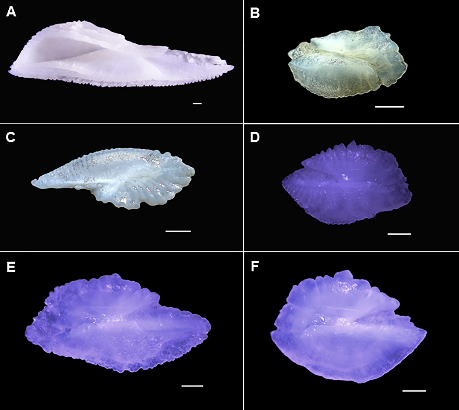 Representative samples of fish otoliths used in the study. (A)Thunnus albacares, (B)Selar crumenophthalmus, (C)Decapteus kurroides, (D)Nemipterus hexodon, (E)N. japonicus, and (F)N. nematopus. Scale bar: 1 mm.