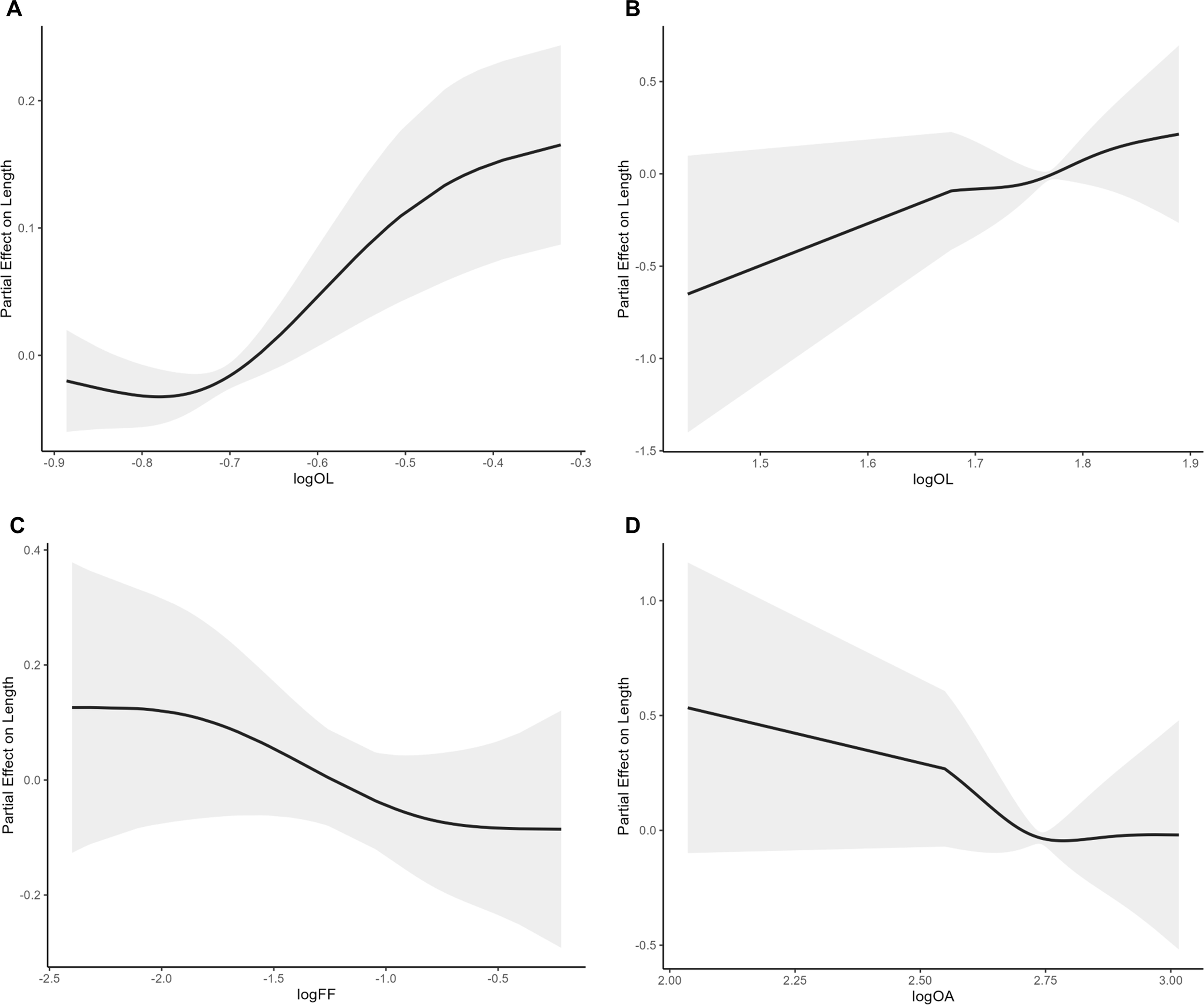 Cross-validated GAMs (Table 3) further highlighted differences in the functional form and predictive value of otolith variables among species. Across species, D. kurroides and S. crumenophthalmus demonstrated the greatest benefit from GAM flexibility, whereas several demersal taxa showed little improvement over their best linear or nonlinear models.
