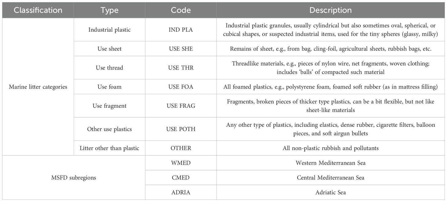 Table 1. Classification of marine litter per category and MSFD subregions (Galgani et al., 2013, 2023; Jensen et al., 2015).