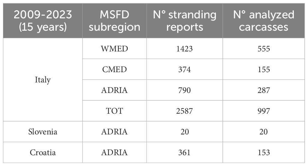 Table 2. Stranding reports and analyzed carcasses within Italy, Slovenia, and Croatia between 2009 and 2023, and the MSFD subregions.