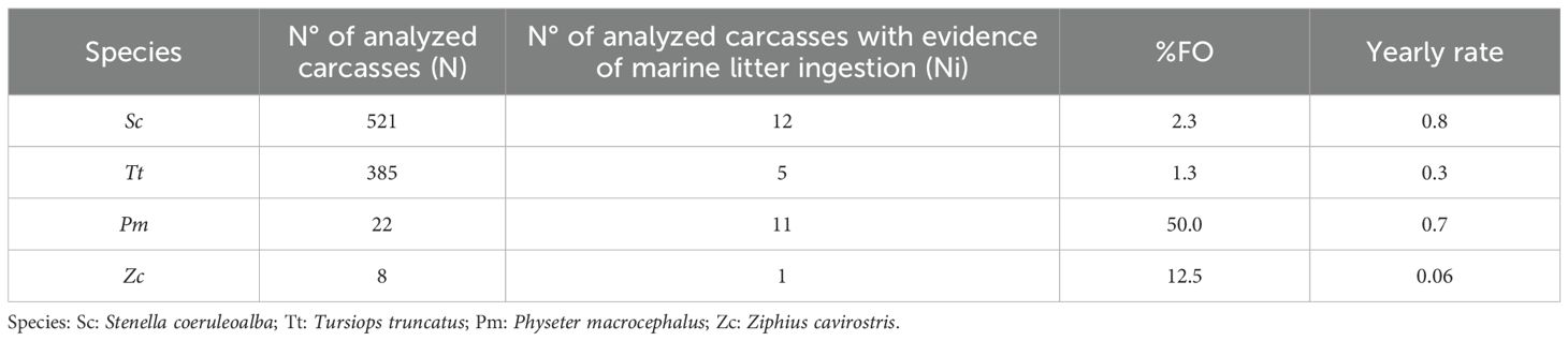 Table 3. Frequency of occurrence (%FO) and yearly rate of marine litter ingestion by species in Italy (2009–2023).