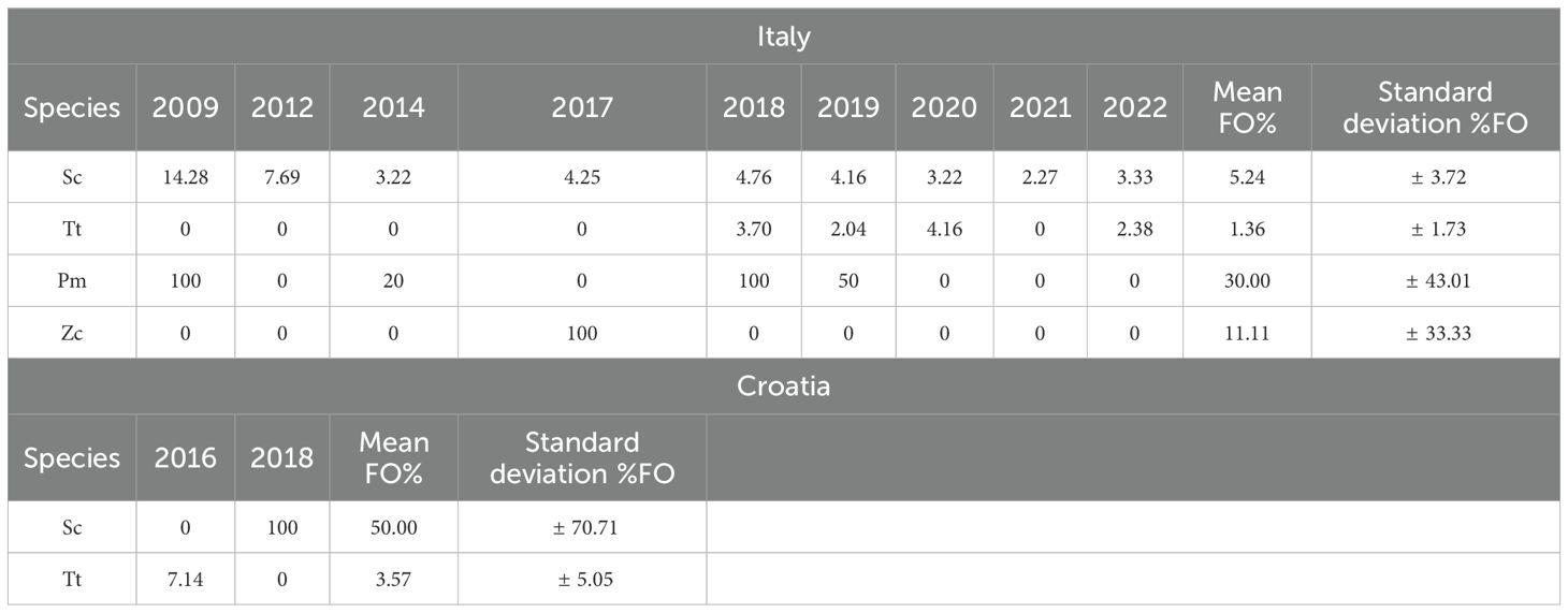 To further evaluate temporal and regional variability, the %FO was calculated for each species in each year within the 2009–2023 study period. Annual %FO values were then used to derive the mean and standard deviation (SD) across years, providing an estimate of uncertainty around ingestion frequency and allowing comparison of interannual variability between Italy and Croatia.