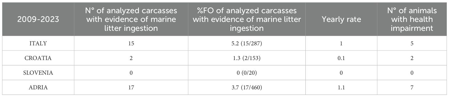 Table 5. Summary of number and %FO of analyzed carcasses with evidence of plastic litter ingestion, yearly rate, and number of animals with health impairment in the Adriatic Sea subregion (ADRIA).