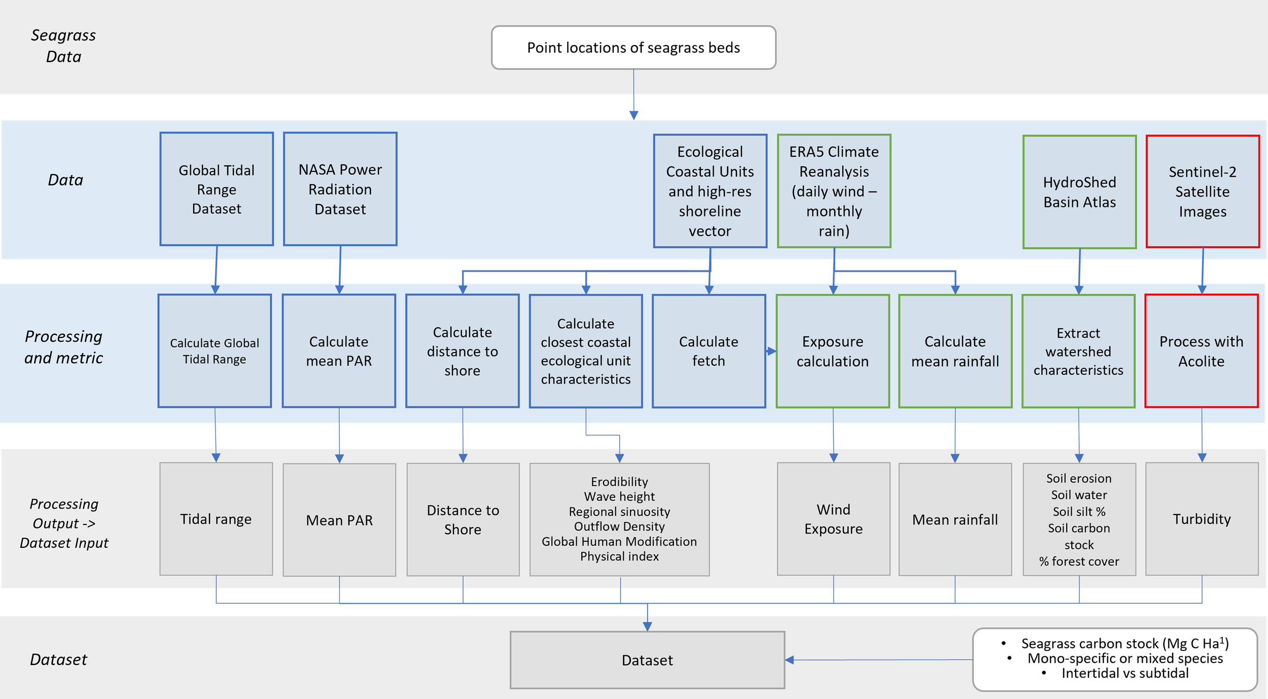 A range of ocean color parameters (Secchi depth, slope of particle backscattering () and diffuse water coefficient (Kd) suspended particulate matter, turbidity, chlorophyll-a) were derived from Sentinel-2 satellite imagery using ACOLITE algorithms. The ACOLITE processor, developed by the Royal Belgian Institute of Natural Sciences, and refined for use with Sentinel 2 imagery (Vanhellemont and Ruddick, 2016) is an image processor that performs atmospheric correction and additionally can process several parameters derived from water reflectances. It employs a dark spectrum fitting atmospheric correction method designed to give improved results in turbid waters. Sentinel-2 tiles required for processing were identified using QGIS by comparing sampling points and the Sentinel-2 granule boundaries. A 20 km buffered box was created around each point to produce extraction areas. Where there was more than one seagrass site per scene, a larger bounding box was drawn around the sites. The identified Sentinel-2 scenes were downloaded from the Google Earth Engine Catalogue from June 2015 to June 2022 (i.e. all datasets up to the point of processing). This included 83 tiles and 86,044 level 1C Sentinel-2 scenes.