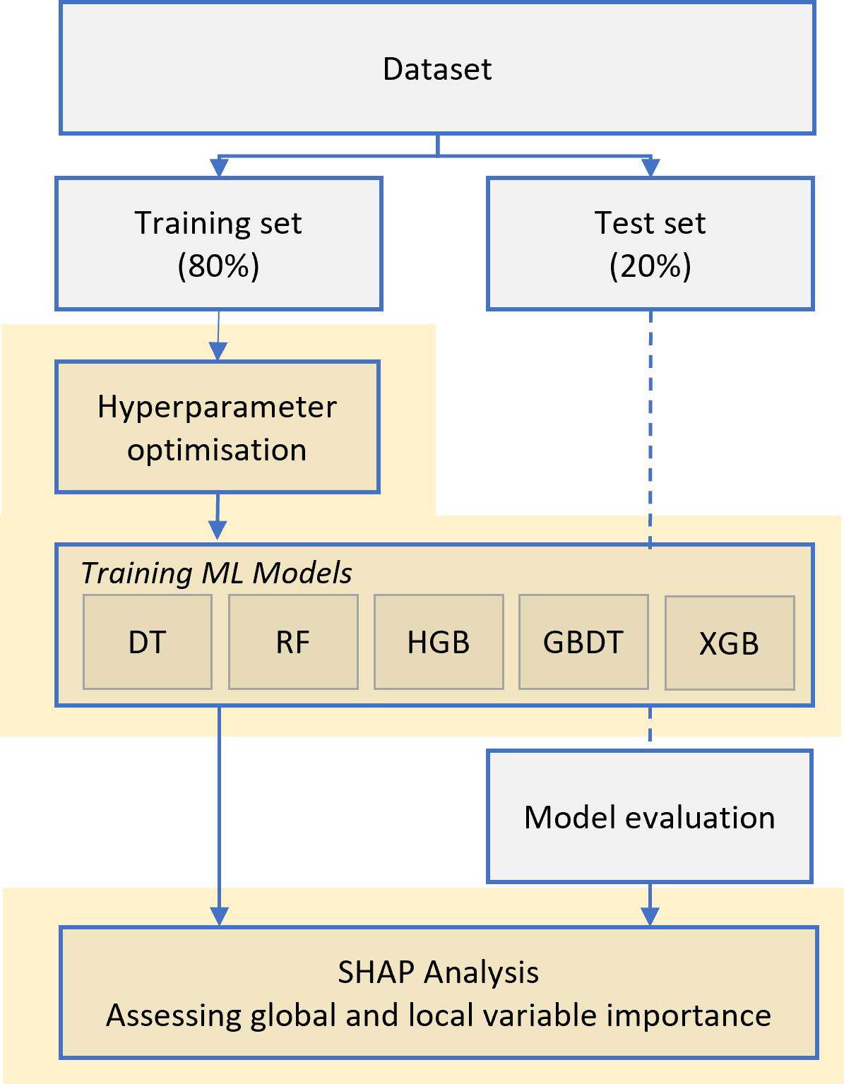 SHAP analysis (Shapely Additive exPlanations) was used to interpret the model and infer insights about the significance of features to the model’s output (Lundberg et al., 2017). As ensemble methods (such as XGBoost and Random Forest) combine the results of many individual learners it is not possible to visualize how the algorithm is generating the result. Explainable ML aims to explain how such models make predictions which gives insight into what features are driving predictions. SHAP uses Shapley values (Shapley, 1953), a method derived from cooperative game theory, to explain the output of any ML model by attributing a ‘players’ contribution to the game (Lundberg et al., 2017). SHAP values are therefore measures of the contribution that each feature has on the outcome of the model.