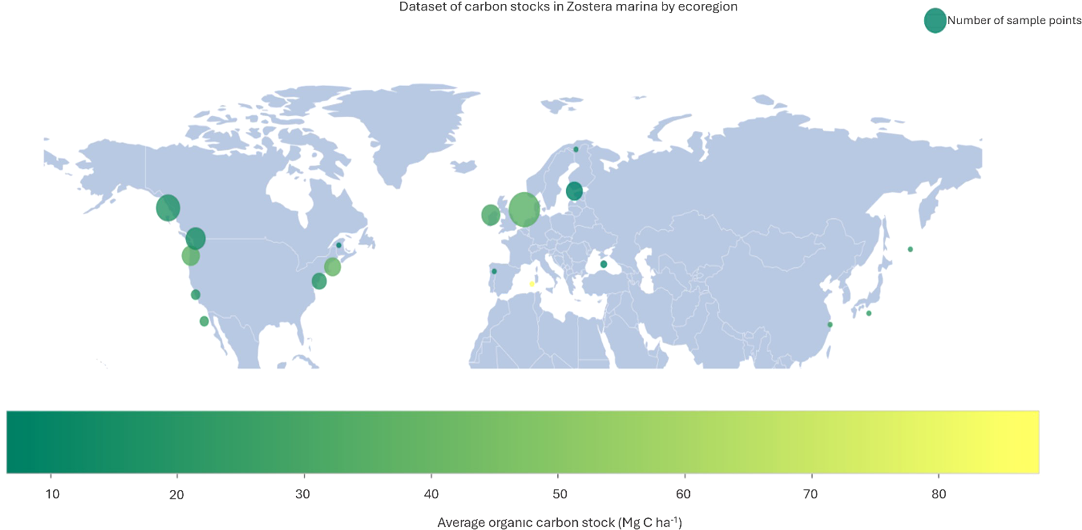 Map of the distribution of Z. marina sample sites showing the number of sites per Ecoregion coloured by mean carbon stock (Mg C ha-1) to 25 cm depth. (Yellow = higher carbon, green = lower carbon). The size of the marker represents the number of sample points within each Ecoregion.