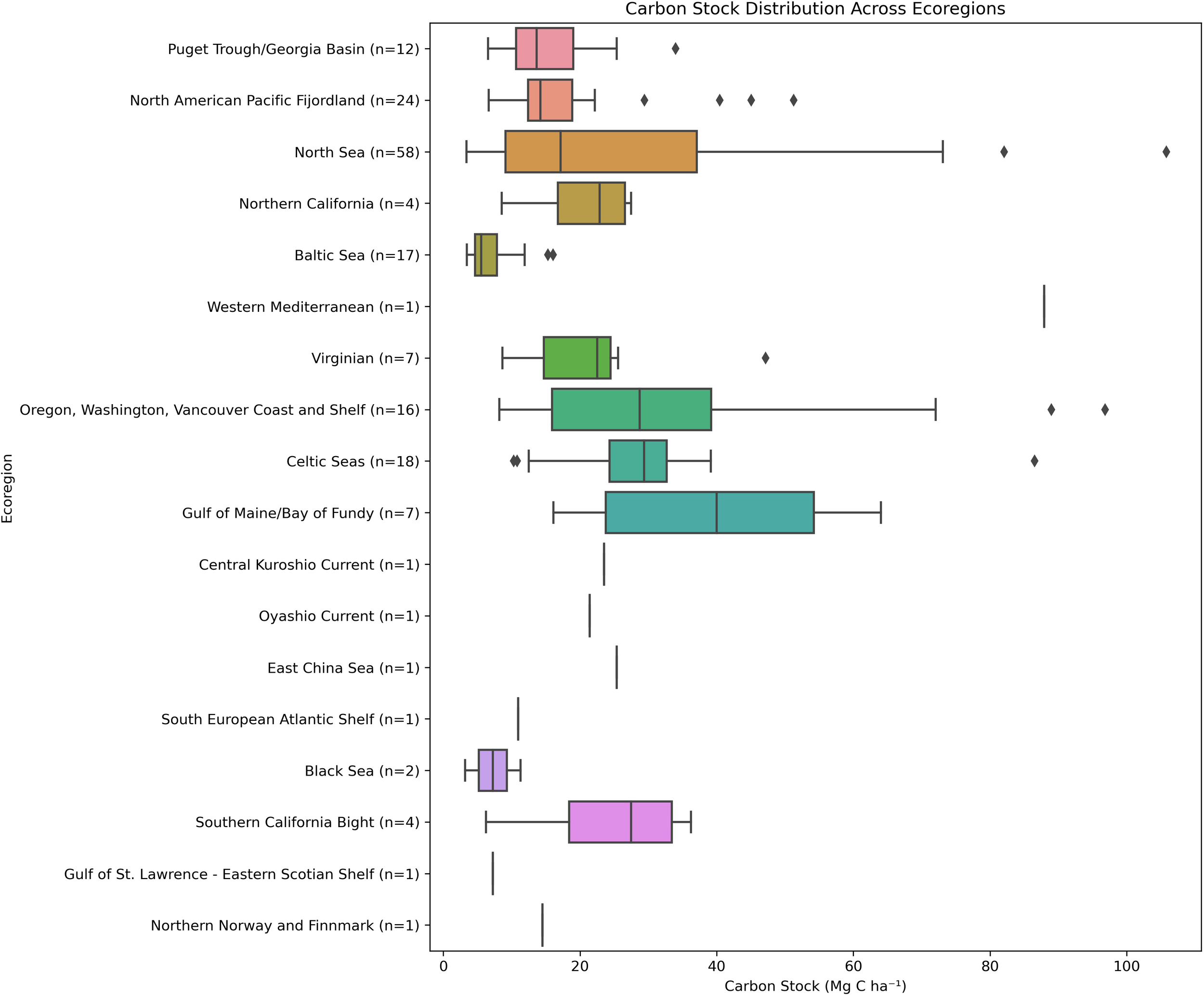 Distribution of Z. marina organic carbon stocks (Mg C ha-1) in the top 25cm of the sediment by Ecoregion. The number of seagrass locations in each ecoregion are shown in brackets. The boxplots show the three quartile values of the distribution, and the “whiskers” extend to points that are within 1.5 interquartile range of the lower and upper quartile. Observations falling outside of this range are displayed independently. Differences in carbon stock across ecoregions were statistically significant (Kruskal-Wallis p-value< 0.001).