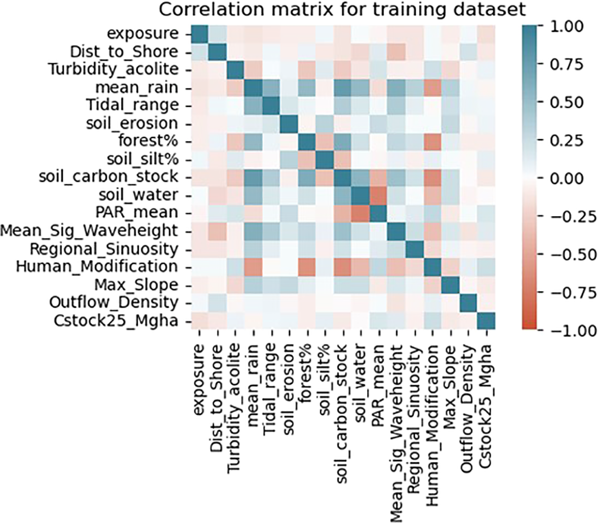 After the removal of highly correlating variables, the highest correlating pairs in the final dataset were soil carbon stock and mean rain (+0.76), soil water and mean PAR (-0.70) and human modification and soil carbon stock (-0.63) (Figure 5). The dataset was split 80% for the train set and 20% as an out-of-sample test dataset resulting in a dataset size of 140 and 36 samples respectively. The response variable train dataset ranged from 3.18 Mg C ha1 to 105.77 Mg C ha1 with a mean of 18.12 Mg C ha1. The test dataset was within the ranges of the train dataset ranging from 3.39 Mg C ha1 to 86.50 Mg C ha1 and a mean of 15.43 Mg C ha1 (see Supplementary Material Figure S3).