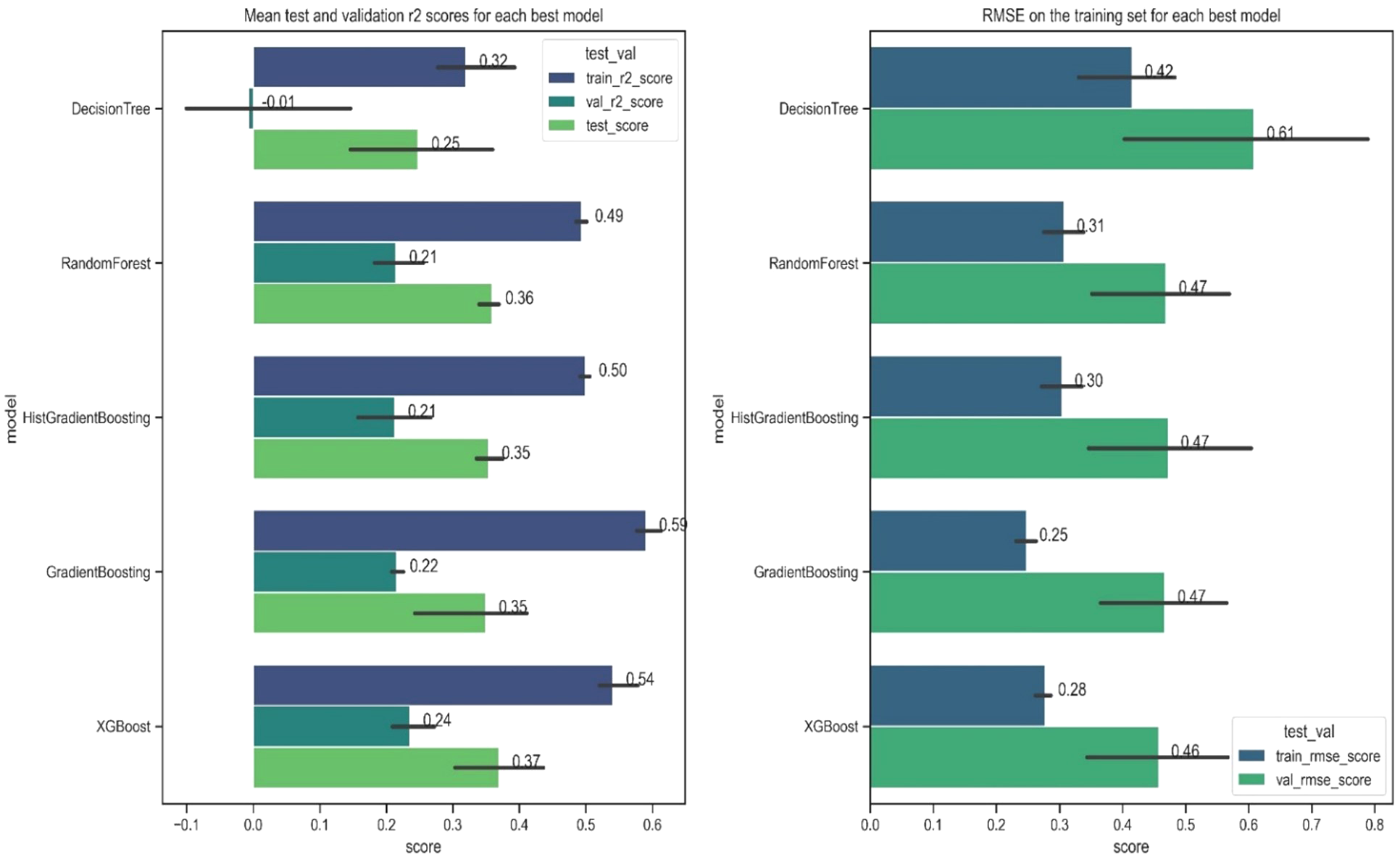Model evaluation plots showing for each model (left) the r-squared for the train, validation and test sets respectively; and (right) the logged RMSE scores for the train and validation sets respectively. The error bars show the uppermost and lowest values of the scores produced during cross-validation.
