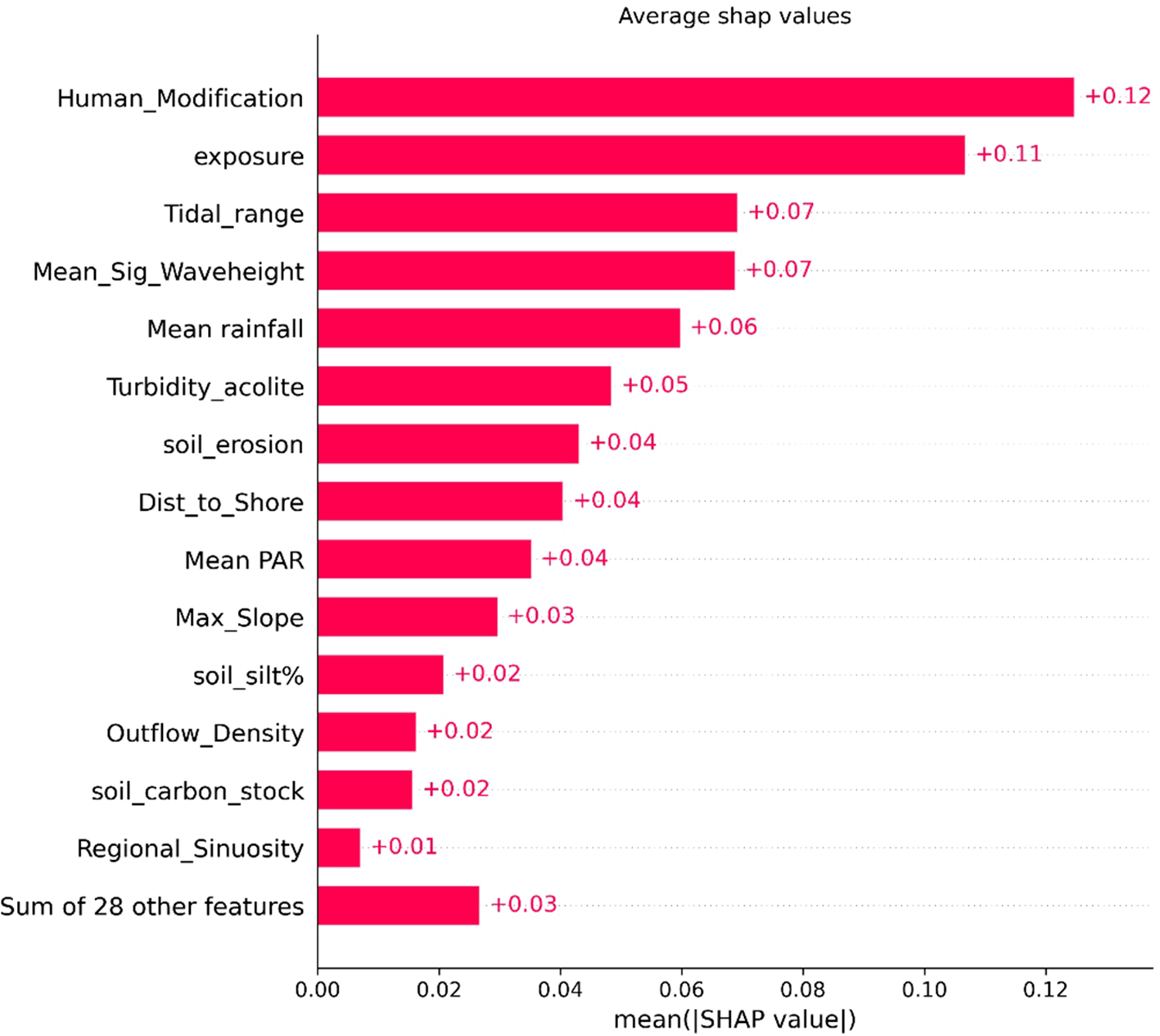 Dependence plots represent a variables SHAP value for a given seagrass bed showing the effect a single feature has on the model predictions (Figure 10) (Lundberg et al., 2017). Human modification at the nearest coast creates a threshold effect with low carbon stocks at low human modification values but shifting into higher carbon values when passing a threshold of around a 0.3 in the human modification index. Exposure suggests a more linear relationship with increasing exposure resulting in lower carbon stocks, except for the lowest exposure levels which has an initial dip.