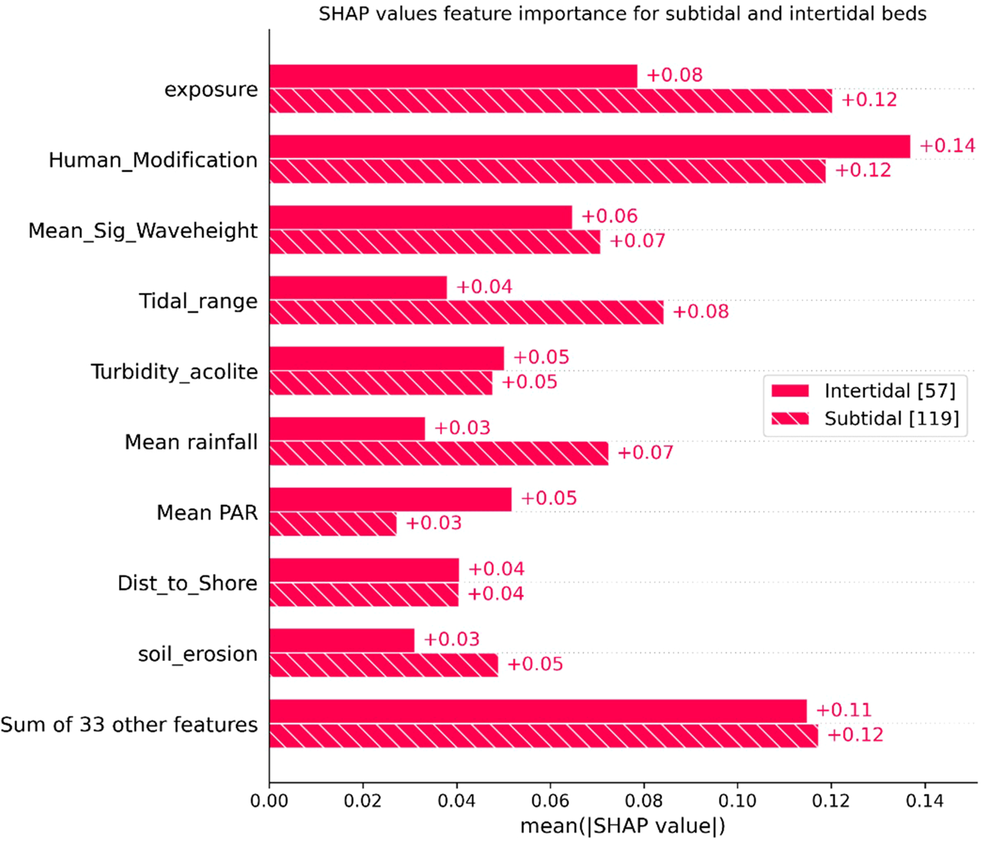 Bar plot illustrating the mean SHAP values for each feature, highlighting their importance across subtidal and intertidal beds. Here, the dataset corresponds to 42 features due to the encoding of categorical variables.