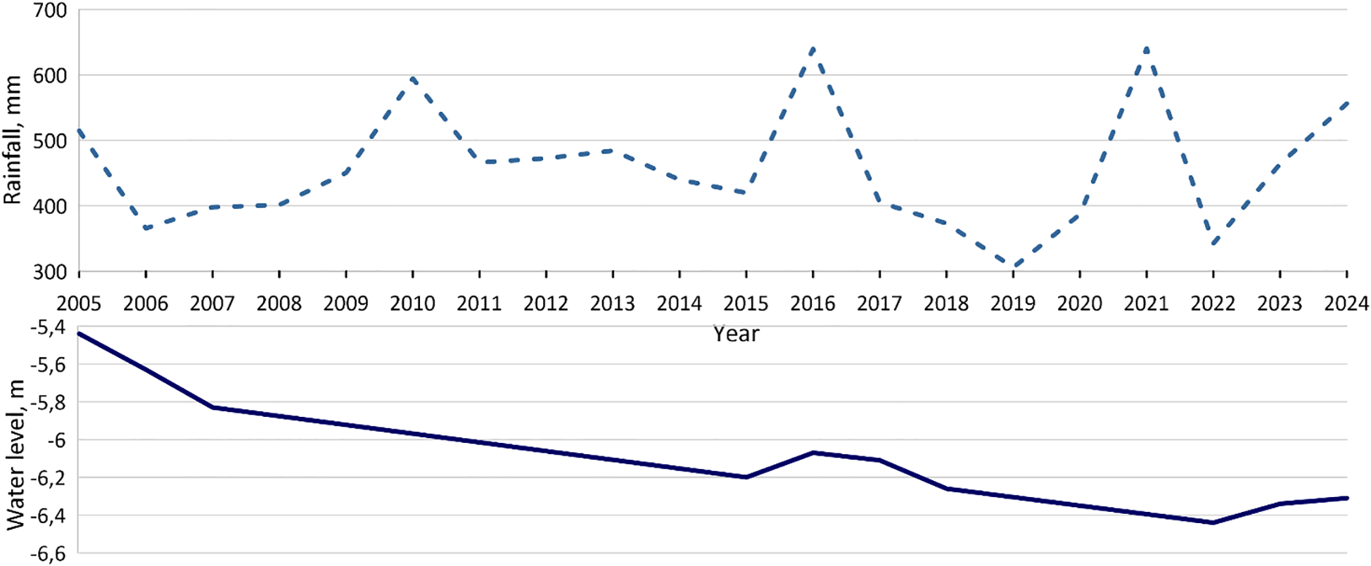 Dynamics of annual precipitation (upper graph) and water level (lower graph) in the Kuyalnik estuary for the period 2005-2024.
