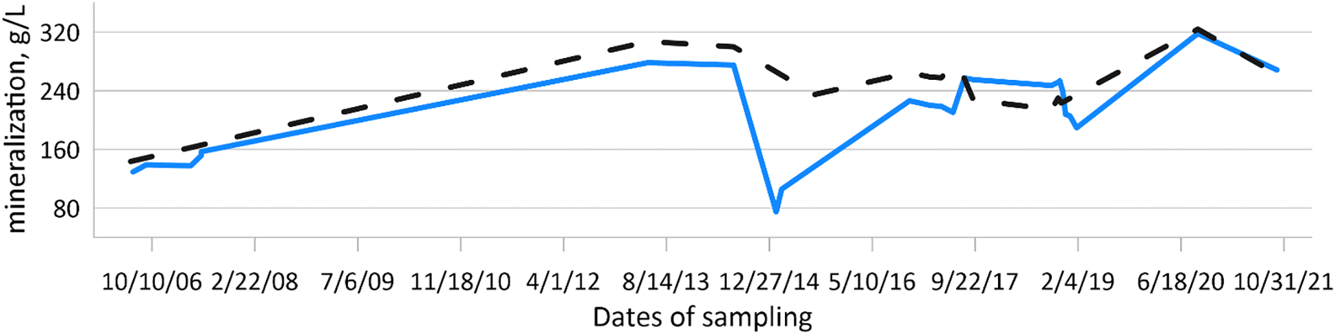 According to the results of physicochemical studies conducted from 2015 to 2021, a rapid increase in the total mineralization of brine was observed, from 74.87 g/L to 318.04 g/L. This indicates that although the mineralization of seawater (12.96-17.60 g/l) is significantly lower than that of brine, with large volumes of seawater supplied to the estuary, there is a significant increase in the amount of salts dissolved in the brine (Figure 2).