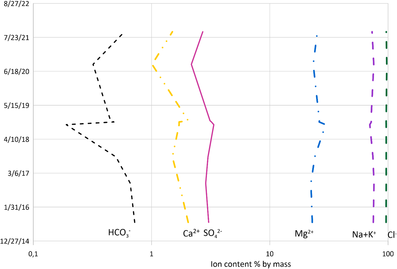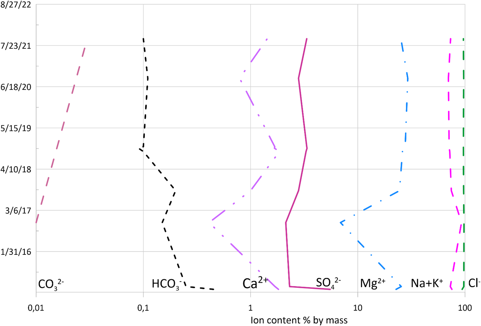 The equivalent composition of the brine for the primary ions remained virtually unchanged over the observation period, except in 2016, when the sodium and potassium ion content increased by ~20 eq.%, while the magnesium ion content decreased by ~20 eq.% (Figure 3). This may be because the mass content of sodium and potassium ions in seawater is approximately 8 times greater than the magnesium ion content. Furthermore, the brine can be considered a multicomponent water-salt system that did not have time to return to its thermodynamic state within the short period of time (~2 years) following the introduction of seawater.