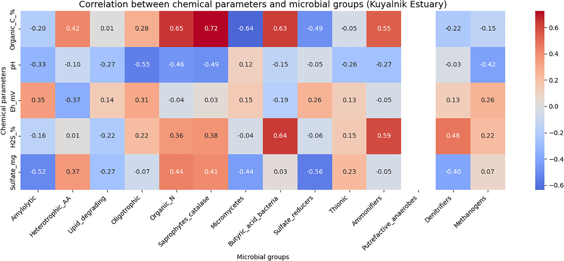 The correlations between chemical parameters and microbial groups in the Kuyalnik Estuary peloids (Figure 5) revealed explicit ecological dependencies.