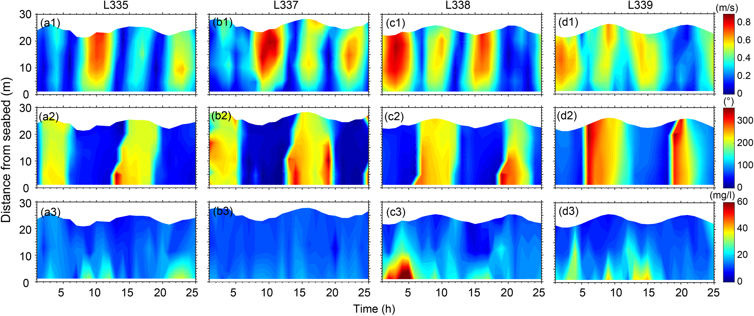 Panels showing (a1–d1) current velocity, (a2–d2) current direction, and (a3–d3) SSC at offshore stations L335, L337, L338, and L339.