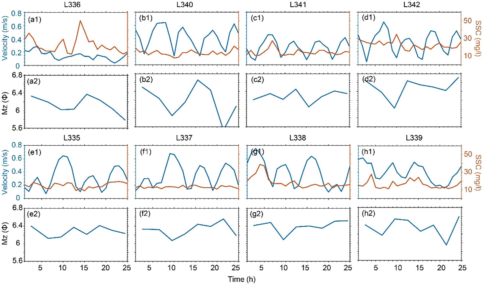 Depth-averaged current velocity and SSC (a1–h1) and sediment grain size (a2–h2) at station L336 inside SHB, stations L340, L341, and L342 inside and at the mouth of WTB, and offshore stations L335, L337, L338, and L339.