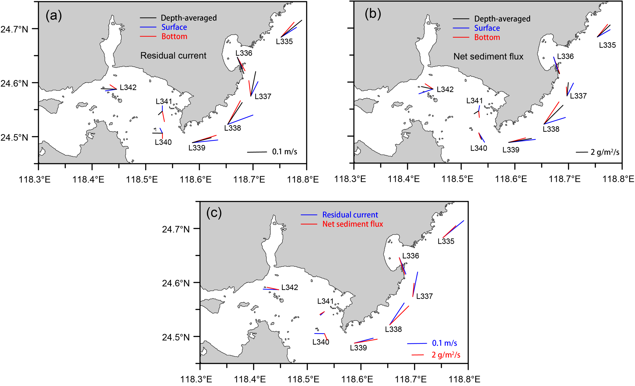 Depth-averaged net SSF at L336 in SHB was directed seaward at 2278 mg/m²/s (Figure 5b). In WTB, depth-averaged net SSFs directions at L341 and L342 closely align with the residual currents, whereas at L340, they differ, with sediment transported seaward. The fluxes at these stations are relatively low (435, 153, 128 mg/m²/s). Offshore stations (L335, L337–L339) showed depth-averaged net SSFs generally aligned with residual currents, northeastward along the coast (2278, 1537, 3882, 3227 mg/m²/s). The directional difference at L338 was slightly larger (~10°), which is mainly related to the combined effects of tidal asymmetry, sediment grain size distribution, and local topography. Surface and bottom fluxes generally followed residual current patterns, consistent with depth-averaged fluxes in SHB and offshore, except at L338. Within WTB, surface and bottom residual currents at L342 and L340 were similar, while L341 flowed oppositely.