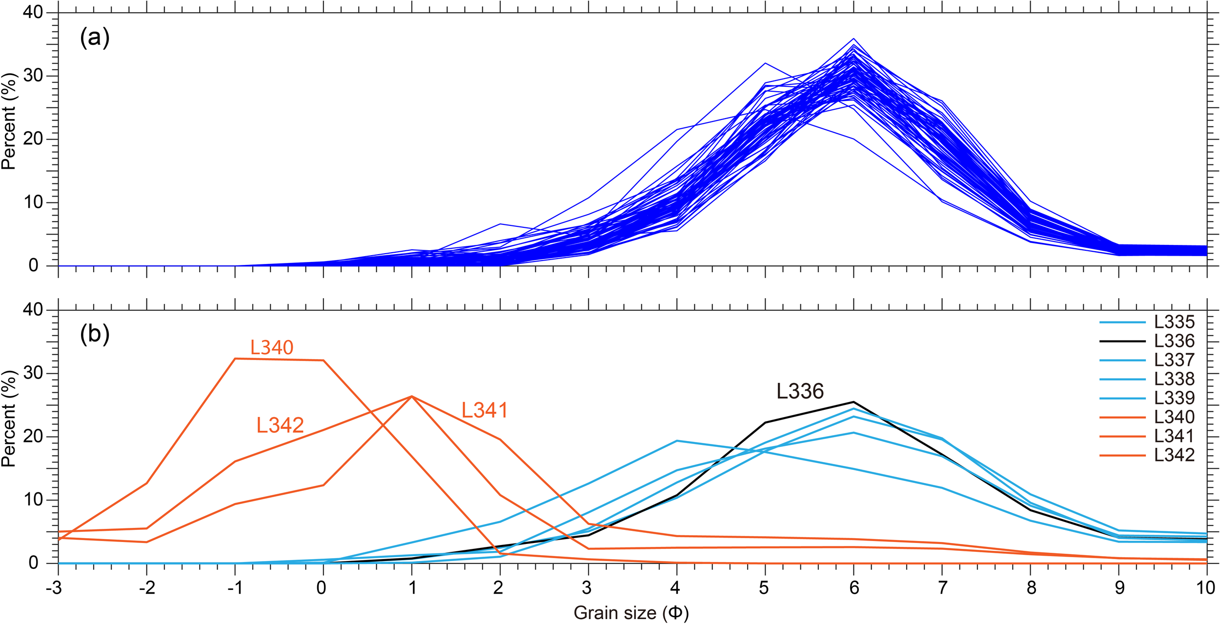 Suspended sediment grain size varied during the observation period but did not strictly correspond with tidal current velocity due to low sampling frequency (three hours). Variations in suspended sediment grain size were larger inside the bays and smaller offshore (Figure 4), with mean φ between 5.6 and 6.8 and roughly overlapping distribution curves (Figure 6a). Surface sediment grain sizes differed: at SHB and offshore stations (L335–L339), surface and suspended sediments were similar, with the coarsest surface sediment at L339 near WTB (φ = 5.56). Inside WTB (L340–L342), surface sediments were medium to coarse sand (φ = 0–2.11), while suspended sediments were silt-dominated (φ = 6.13–6.49).