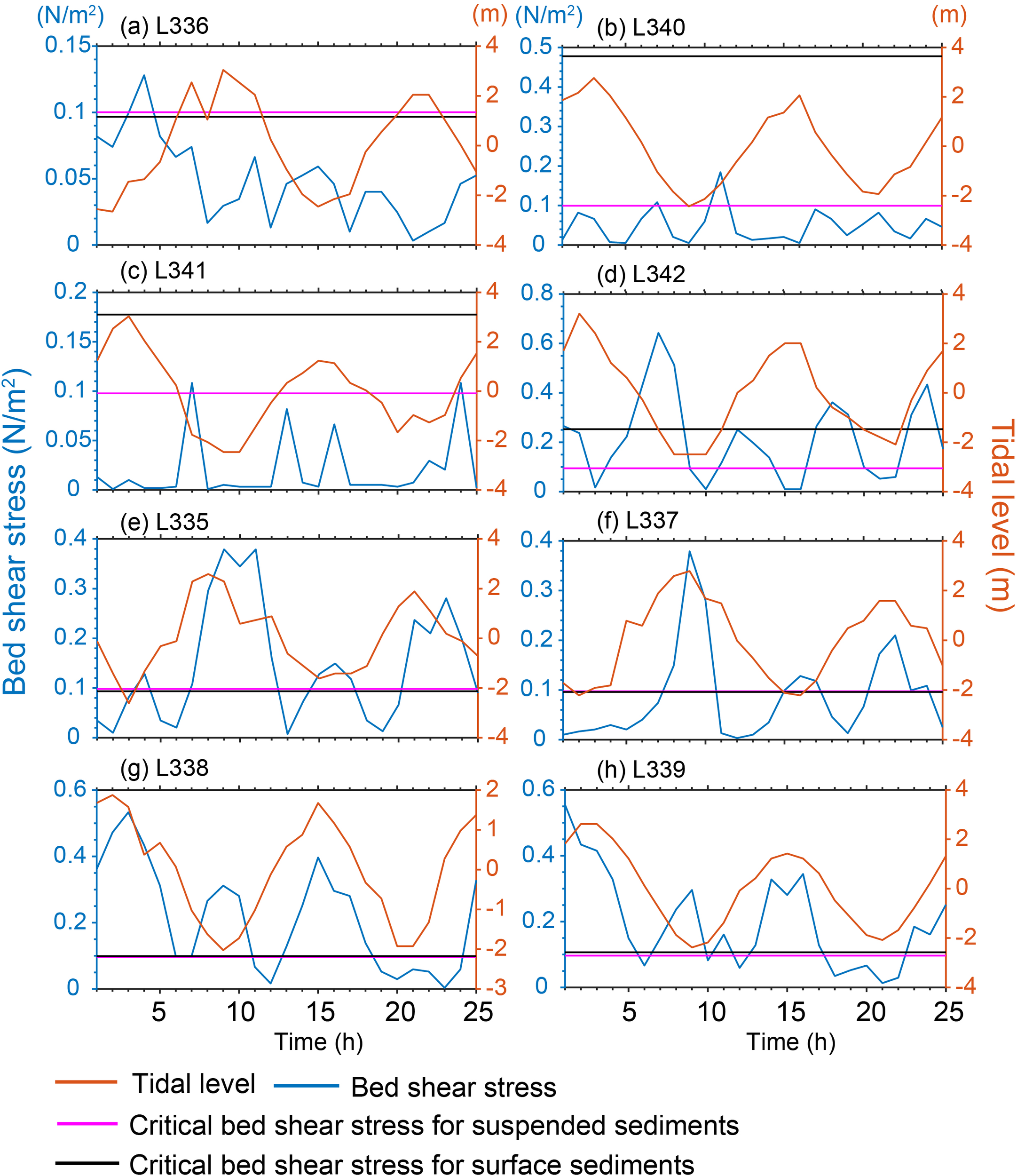 Variations in measured bed shear stress, the critical bed shear stress of suspended and surface sediments, and tidal level at SHB (L336 (a)), WTB (L340 (b), L341 (c) and L342 (d)), and offshore (L335 (e), L336 (f), L338 (g) and L339 (h)) stations during the observation period. Orange lines represent the tidal level, blue lines represent the bed shear stress, and the pink and black lines represent the critical bed shear stress for suspended and surface sediments, respectively. Time (h) is shown on the x-axis.