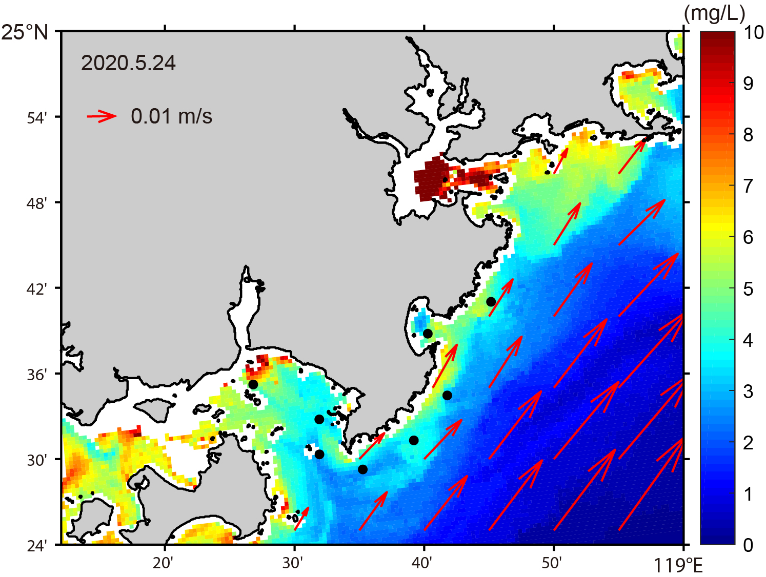 Spatial distribution of surface SSC derived from GOCI imagery (2020-5-24 05:16 UTC) and circulation from the CMEMS (2020.5.24). Black dots indicate observation stations. The length of arrows represents the current velocity magnitude.