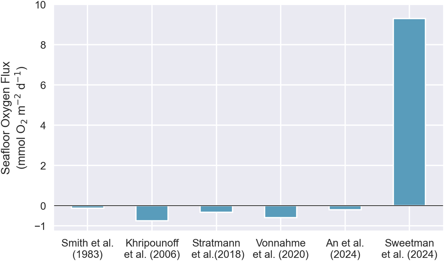 To date, no other study has independently observed DOP. Numerous investigations of seafloor oxygen fluxes using benthic chamber landers—functionally similar to the benthic chamber lander used by Sweetman et al. (2024)—have been conducted in polymetallic nodule-bearing regions across the Pacific, including the Clarion Clipperton Zone (CCZ), the Peru Basin, and sites in the central and eastern North Pacific (Smith et al., 1983; Khripounoff et al., 2006; Stratmann et al., 2018; Vonnahme et al., 2020; An et al., 2024). All of these studies measured oxygen consumption at rates consistent with the global average for the abyssal zone (0.8 ± 0.8 mmol O2 m-2 d-1; Jørgensen et al., 2022). Sweetman et al. (2024), whose study was also conducted in the CCZ, acknowledge that their findings diverge from previous abyssal seafloor observations in general, but they do not reference or engage with the specific comparable studies conducted at nodule-rich sites, all of which consistently show no evidence of oxygen production (Figure 1). When considered against the prevailing body of evidence, the DOP result stands out as anomalous.