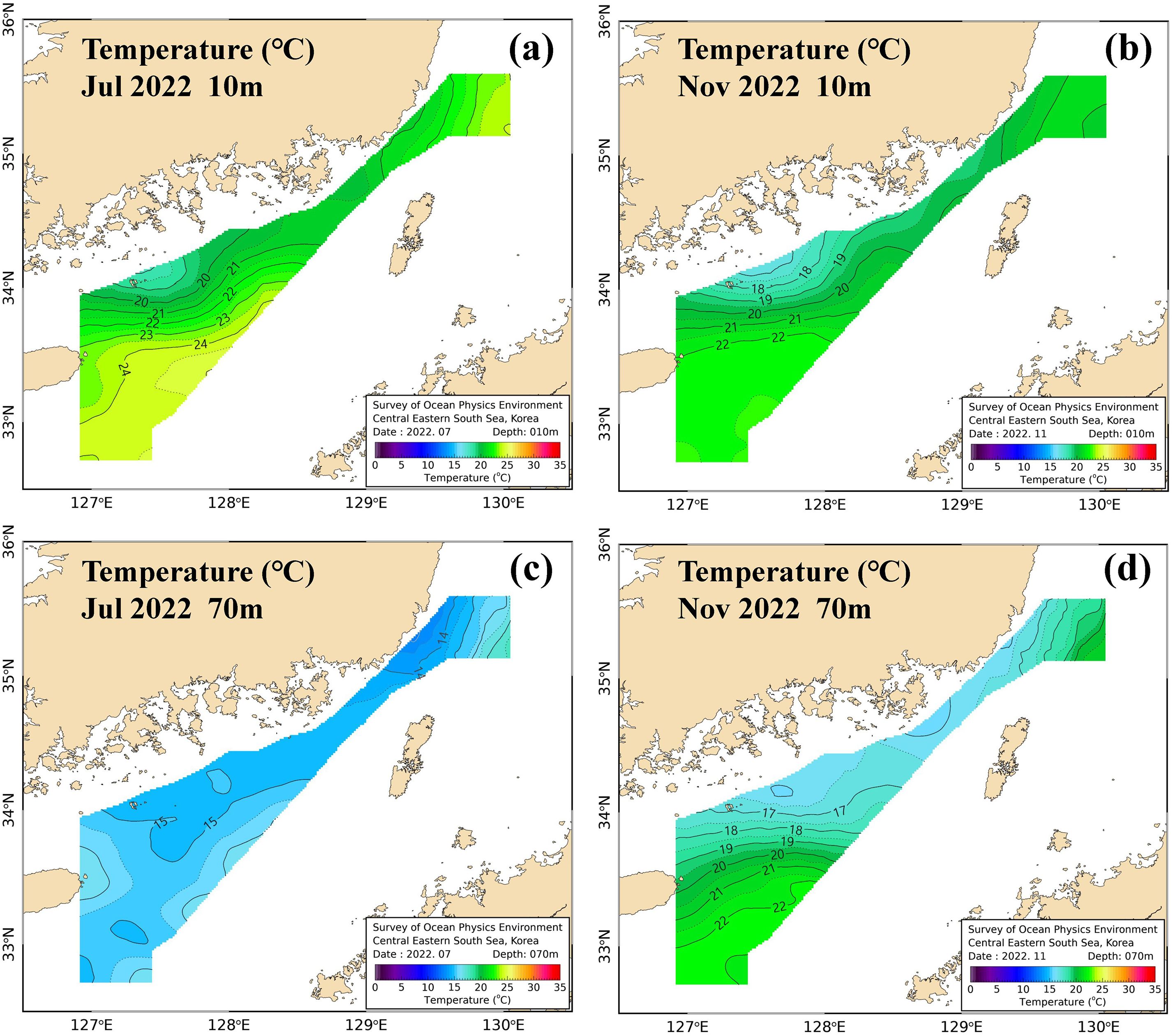 Figure 2. Horizontal distributions of temperature at 10 m and 70 m in July and November 2022: (a) July at 10 m, (b) November at 10 m, (c) July at 70 m, and (d) November at 70 m.