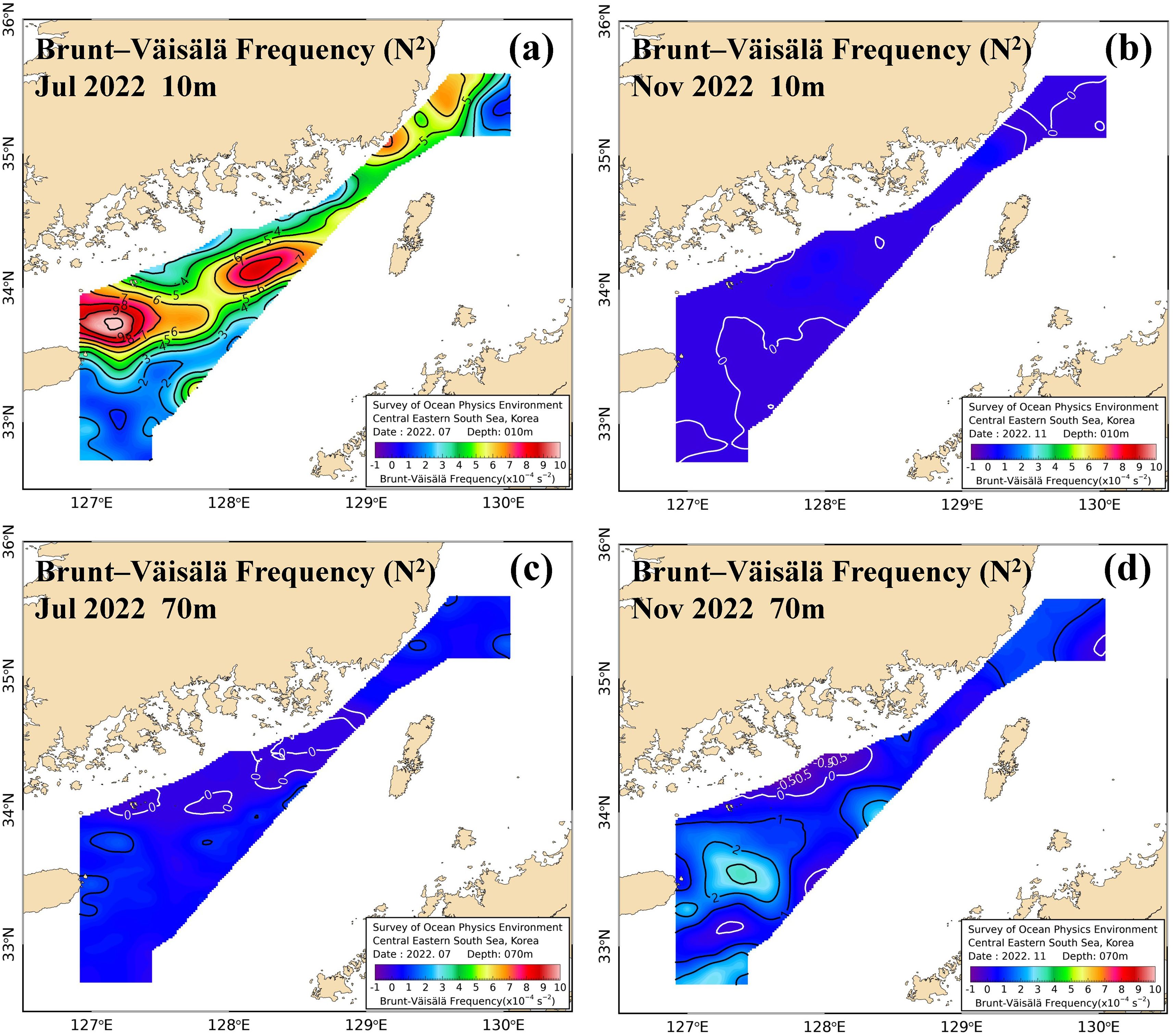 Figure 4. Horizontal distributions of Brunt–Väisälä frequency (N², × 10−4 s−²) at 10 m and 70 m in July and November 2022: (A) July at 10 m, (B) November at 10 m, (C) July at 70 m, and (d) November at 70 m.
