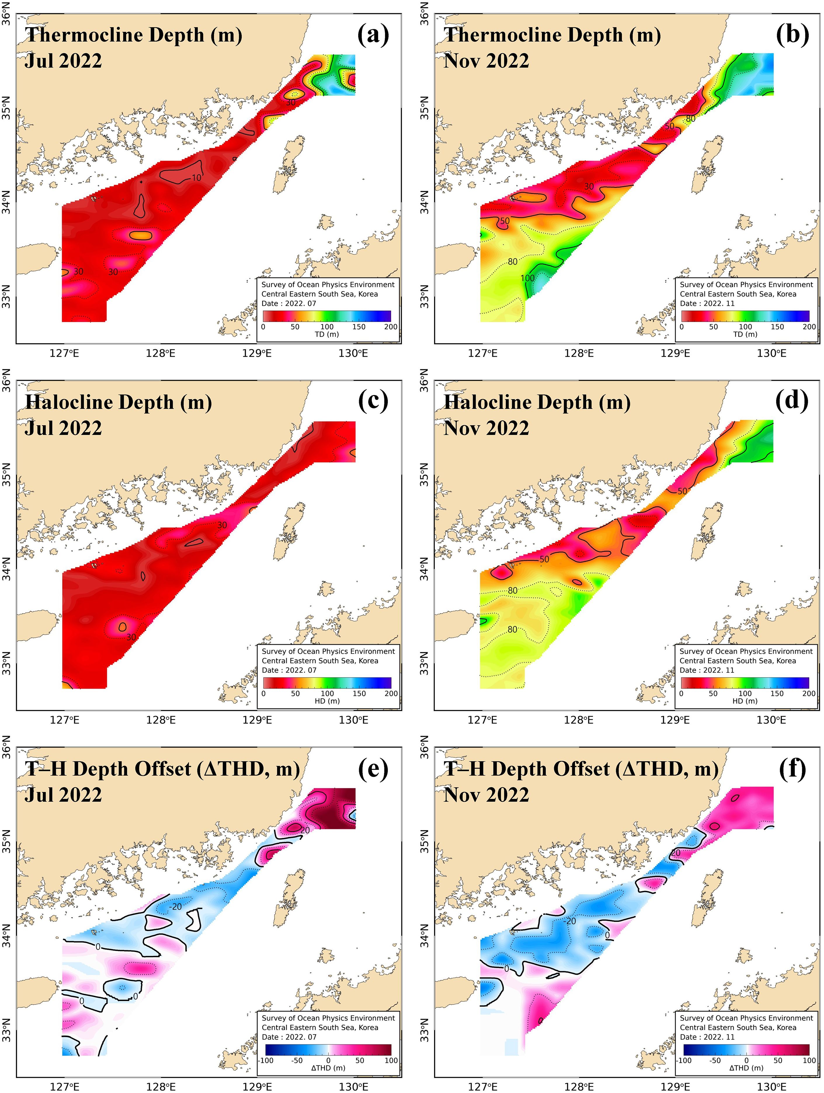 Figure 5. Horizontal distributions of thermocline depth (TD), halocline depth (HD), and their offset (ΔTHD = TD − HD) in July and November 2022. Positive values indicate a deeper thermocline than halocline, and negative values indicate a shallower thermocline: (A) TD in July, (B) TD in November, (C) HD in July, (D) HD in November, (E) ΔTHD in July, and (F) ΔTHD in November.