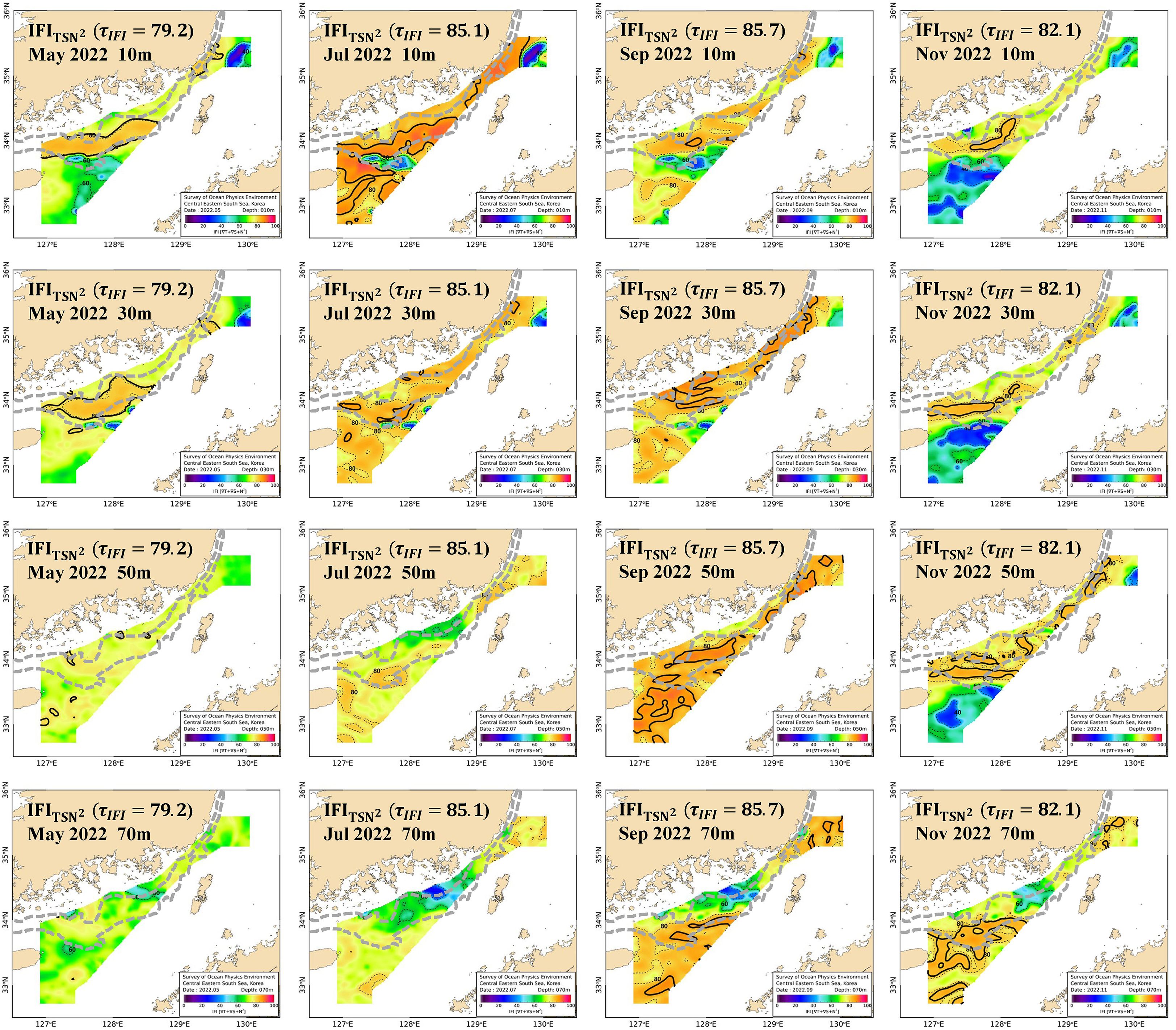 Figure 6. Horizontal distributions of at depths of 10, 30, 50, and 70 m. The first, second, third, and fourth columns correspond to May, July, September, and November 2022, respectively. Thick black contours denote the IFI fronts, defined by the 85th percentile threshold (top-15% threshold; τIFI = 79.2 in May, 85.1 in July, 85.7 in September, and 82.1 in November). Light gray dashed lines indicate the 70 and 100 m isobaths.