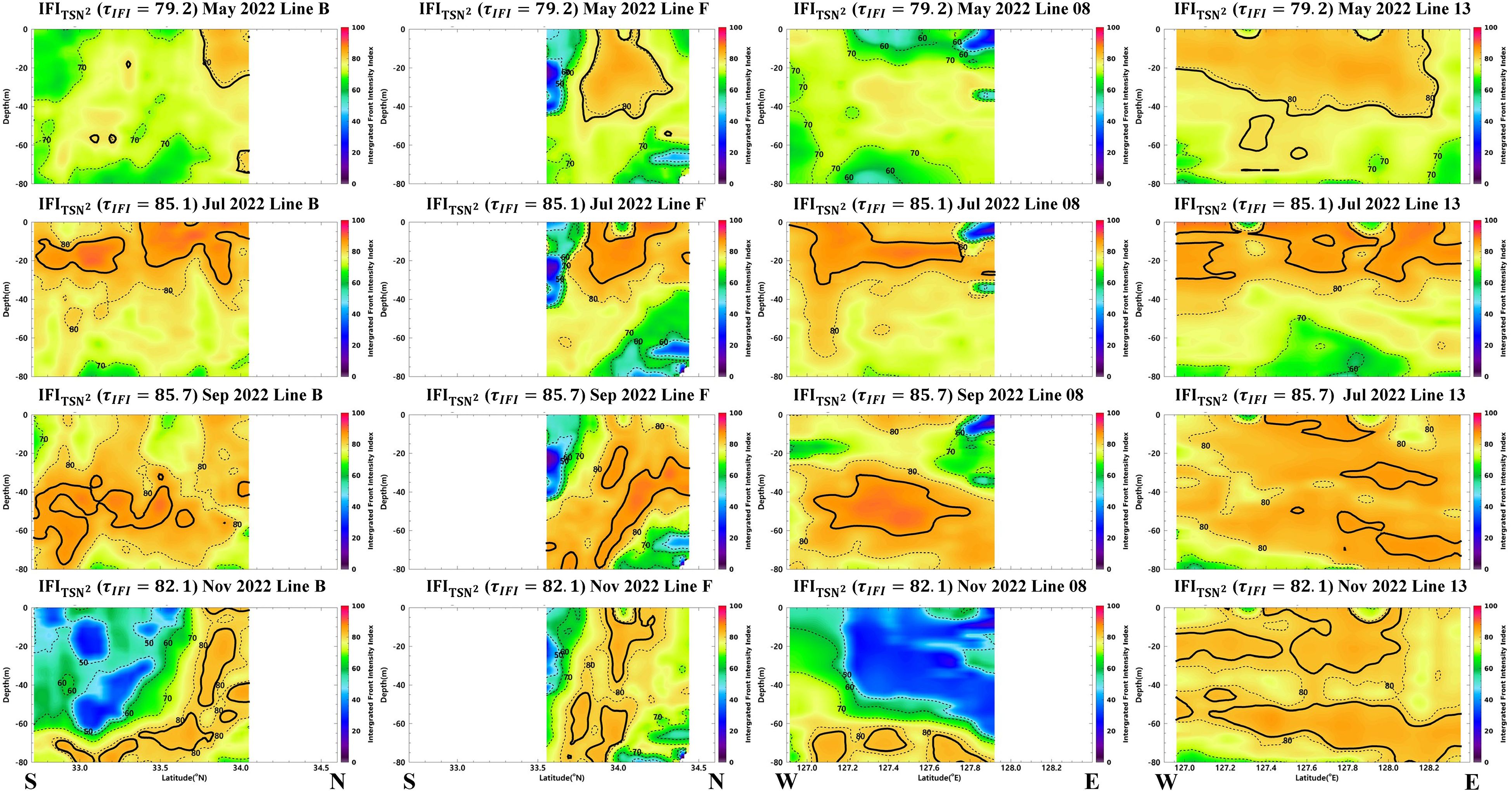 Figure 7. Vertical sections of along observational lines. The first, second, third, and fourth columns correspond to Lines B, F, 08, and 13, respectively, and rows represent May, July, September, and November 2022. Thick black contours denote the IFI fronts, defined by the 85th percentile threshold (top-15% threshold; τIFI = 79.2 in May, 85.1 in July, 85.7 in September, and 82.1 in November).