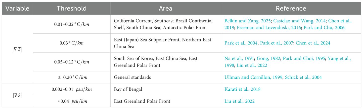 Traditional methods of oceanic front identification primarily define fronts as regions where the horizontal gradient of temperature or salinity exceeds a specific threshold. However, such thresholds have been proposed with considerable variation depending on the type of front, geographic location, season, and research objectives. To ensure reproducibility in the definition of fronts, thresholds reported in previous studies were compiled by variable and category (Table 1). Guided by these literature ranges and by the resolution and noise characteristics of our gridded fields, we adopted conservative baseline thresholds appropriate for continental-shelf settings and within reported ranges: